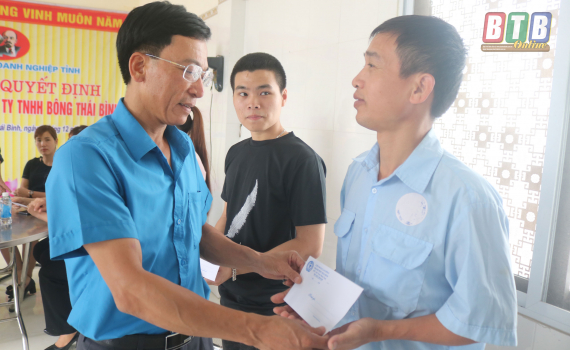 Lãnh đạo Liên đoàn Lao động tỉnh tặng quà cho lao động gặp khó khăn tại Công ty TNHH Bông Thái Bình nhân dịp tháng công nhân.