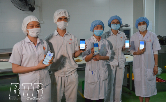 Người lao động tại Công ty Cổ phần Quốc tế Bảo Hưng cài đặt ứng dụng Bluezone để phát hiện dịch Covid-19.
