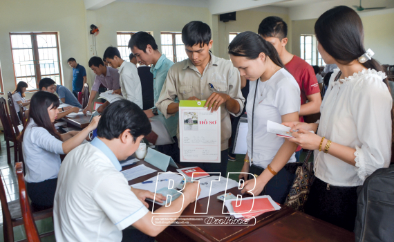 Người lao động nộp hồ sơ đăng ký dự thi tiếng Hàn tại Trung tâm Dịch vụ việc làm Thái Bình.