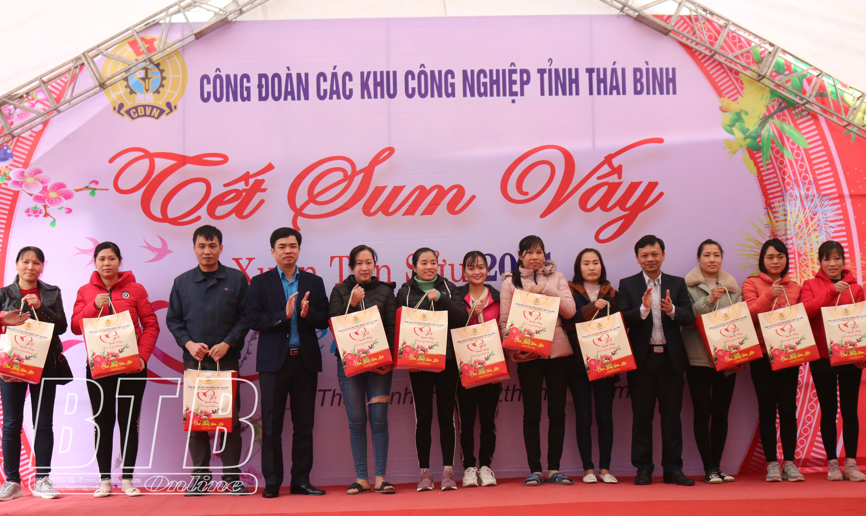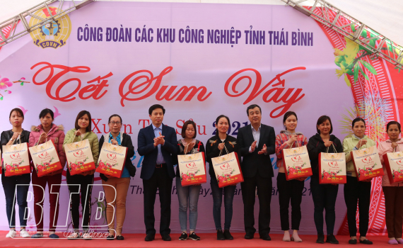 Lãnh đạo Liên đoàn Lao động tỉnh, Ban Quản lý Khu kinh tế và Các khu công nghiệp tỉnh trao quà tết cho công nhân lao động khu công nghiệp Nguyễn Đức Cảnh, thành phố Thái Bình.