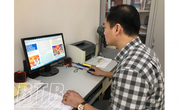 Cán bộ Ban Tuyên giáo-Nữ công (Liên đoàn Lao động tỉnh) thiết kế tờ rơi tuyên truyền về công tác bầu cử.