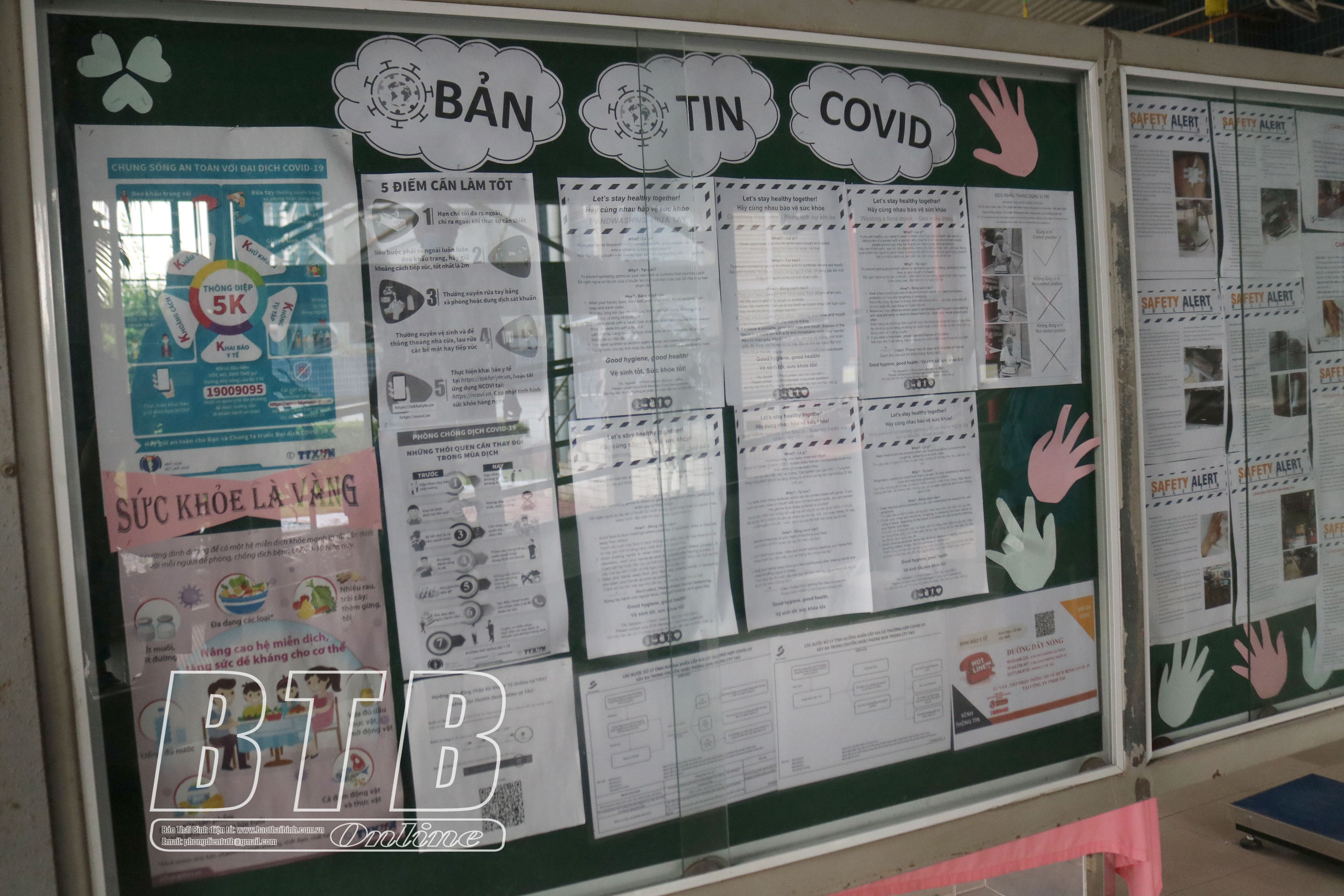 Bản tin về dịch Covid-19 được Công ty TNHH TAV bố trí ở khu vực dễ quan sát để công nhân lao động tìm hiểu các thông tin về cách phòng, chống Covid-19.