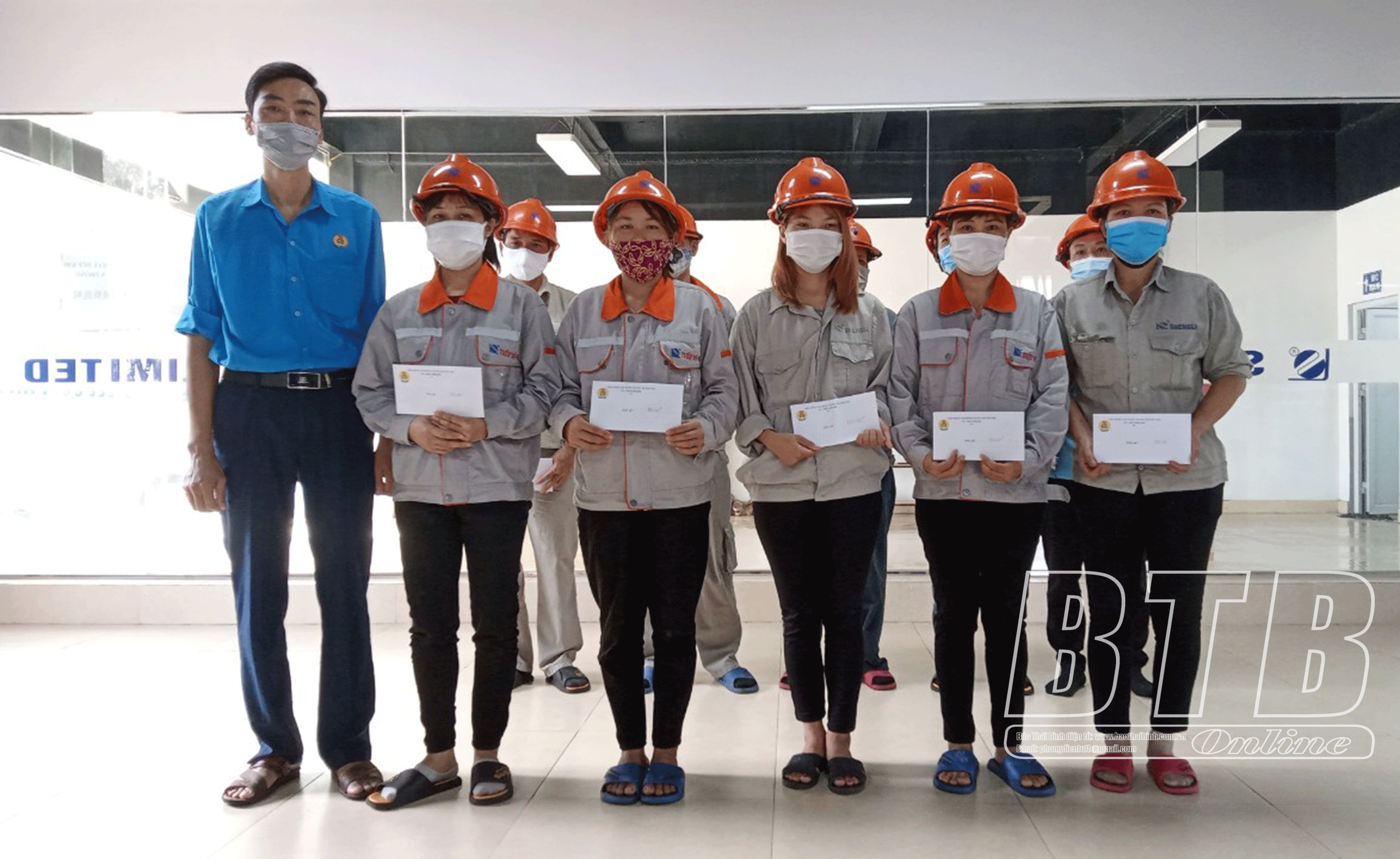 Lãnh đạo Liên đoàn Lao động huyện Quỳnh Phụ trao kinh phí hỗ trợ cho đoàn viên, người lao động Công ty TNHH Thép đặc biệt Shengli Việt Nam bị ảnh hưởng bởi dịch Covid-19.