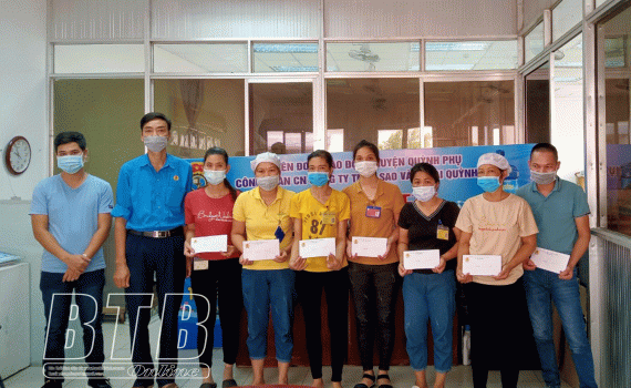 Liên đoàn Lao động huyện Quỳnh Phụ đã trao kinh phí hỗ trợ cho 31 đoàn viên, người lao động của Công ty TNHH Thép đặc biệt Shengli Việt Nam và 26 đoàn viên, người lao động của Chi nhánh Công ty TNHH Sao Vàng tại Quỳnh Phụ. Mỗi đoàn viên, người lao động được hỗ trợ 500 nghìn đồng. Đây là những lao động được hỗ trợ theo Quyết định số 2606 của Tổng Liên đoàn Lao động Việt Nam và Kế hoạch số 123 của Liên đoàn Lao động tỉnh về việc hỗ trợ khẩn cấp cho đoàn viên, người lao động bị ảnh hưởng bởi dịch Covid-19 trong đợt bùng phát dịch lần thứ 4.