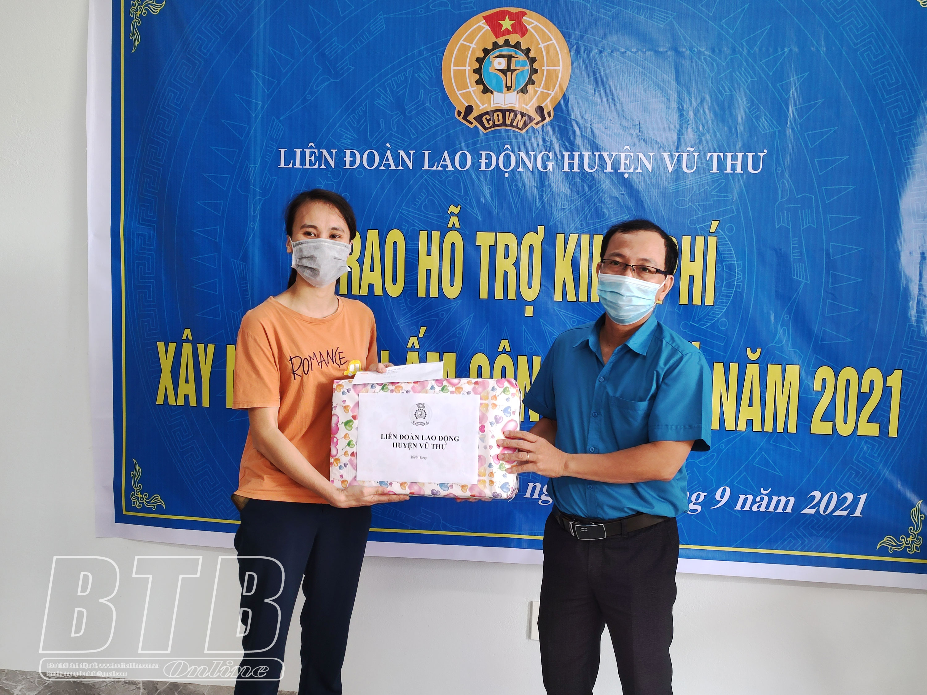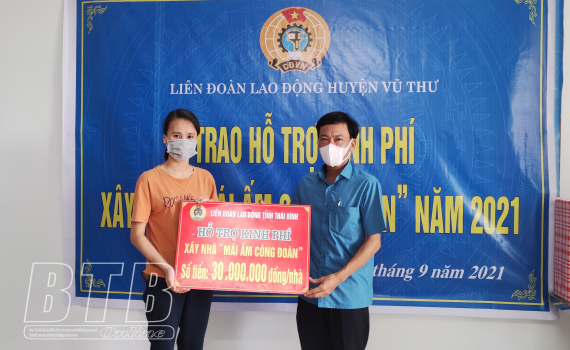 Đoàn viên Đào Hồng Minh làm việc tại Công ty TNHH May xuất khẩu Thiên Tân (Vũ Thư) từ năm 2019. Gia đình chị Minh có hoàn cảnh đặc biệt khó khăn, chồng chị Minh sức khỏe yếu không làm được việc nặng, bản thân chị Minh làm thợ phụ ở Công ty nên thu nhập thấp; gia đình ở trong ngôi nhà cấp 4 đã xuống cấp. Với sự hỗ trợ của công đoàn các cấp, sự giúp đỡ của anh em bạn bè, người thân, tháng 4/2021 ngôi nhà của chị Minh đã được xây mới với diện tích 50m2. Nhân dịp khánh thành nhà mới, Liên đoàn Lao động tỉnh đã trao 30 triệu đồng hỗ trợ xây nhà “Mái ấm công đoàn” cho gia đình chị Minh.