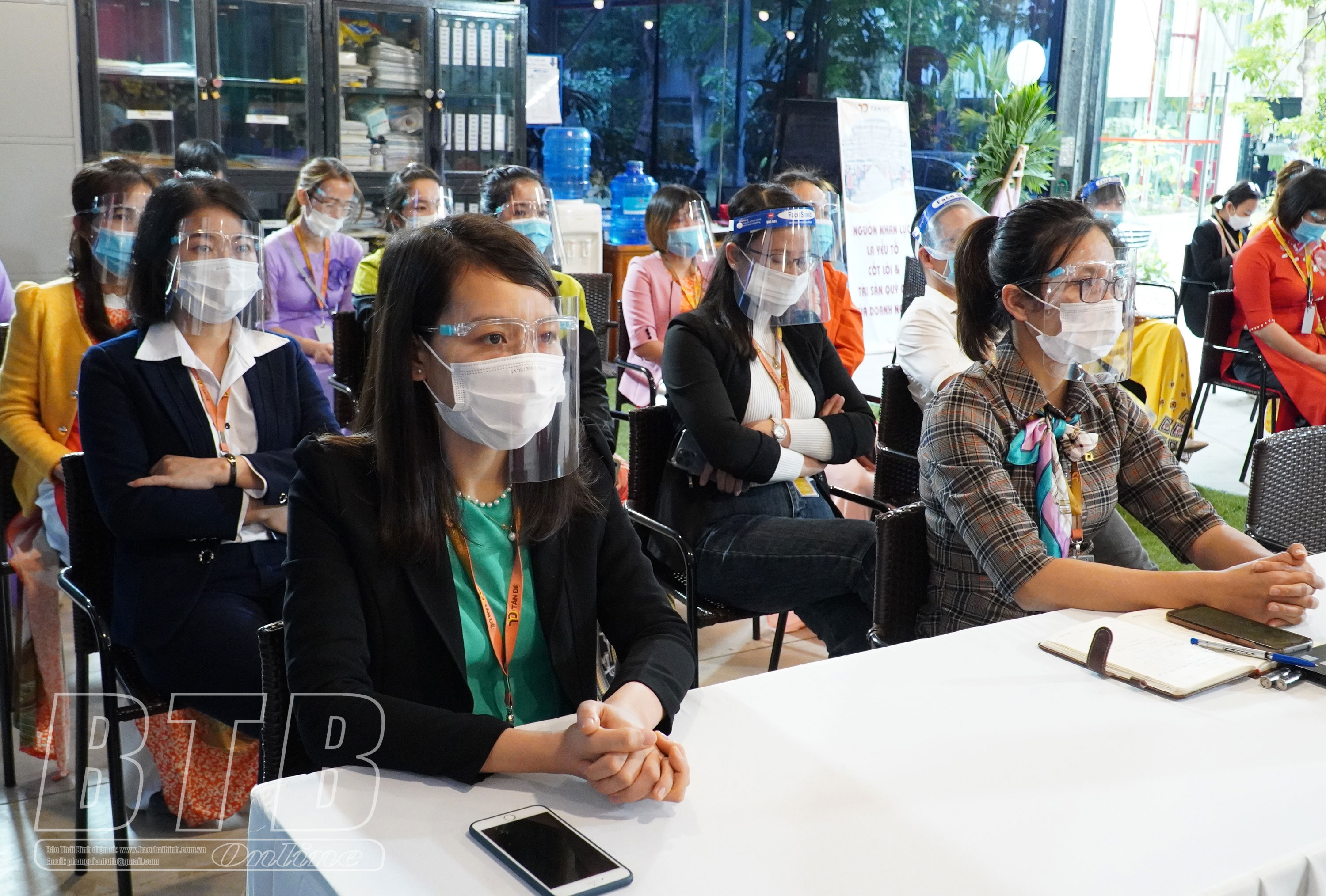 Đại biểu người lao động Công ty Tân Đệ dự hội nghị trực tuyến tại điểm cầu nhà máy Tân Đệ 1, KCN Nguyễn Đức Cảnh, thành phố Thái Bình.