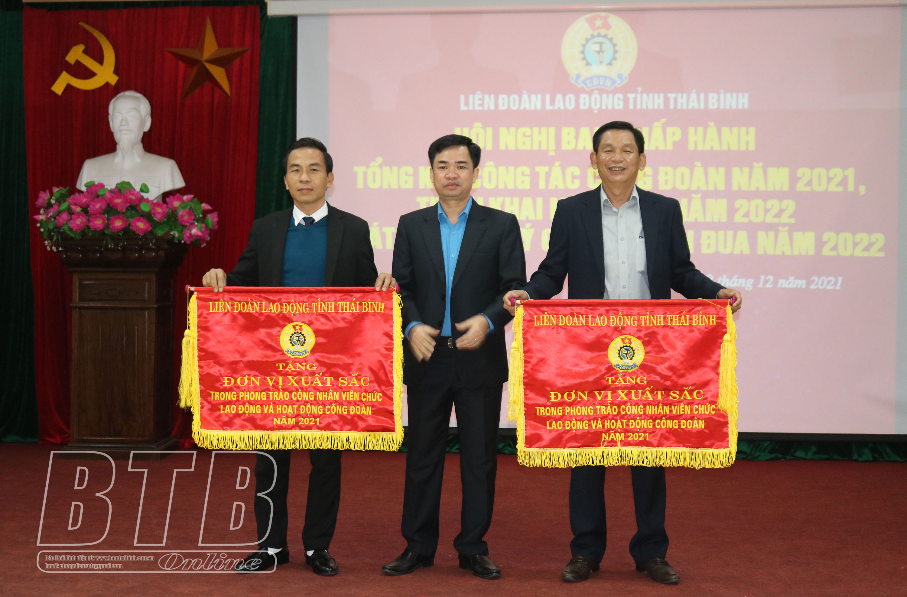 Lãnh đạo Liên đoàn Lao động tỉnh trao cờ thi đua cho đơn vị xuất sắc trong phong trào công nhân, viên chức, lao động và hoạt động công đoàn năm 2021.