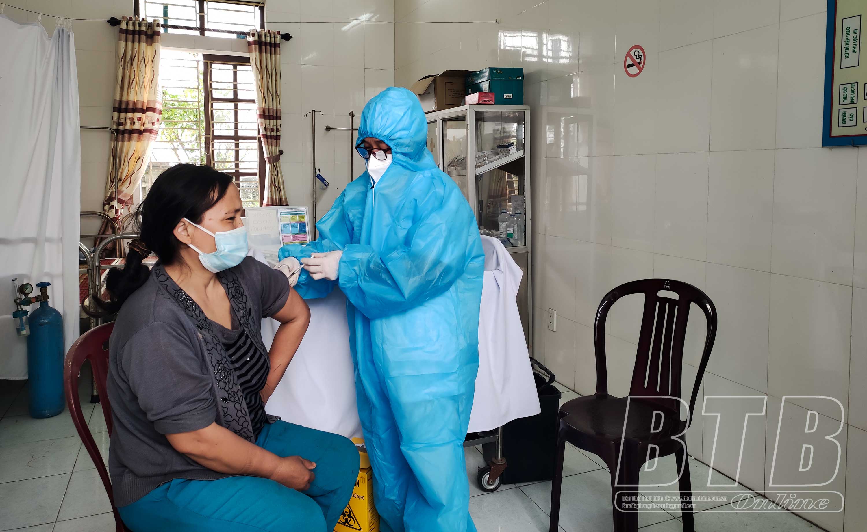 Cán bộ Trạm Y tế xã Minh Lãng (Vũ Thư) tiêm vắc-xin phòng Covid-19 cho người dân.