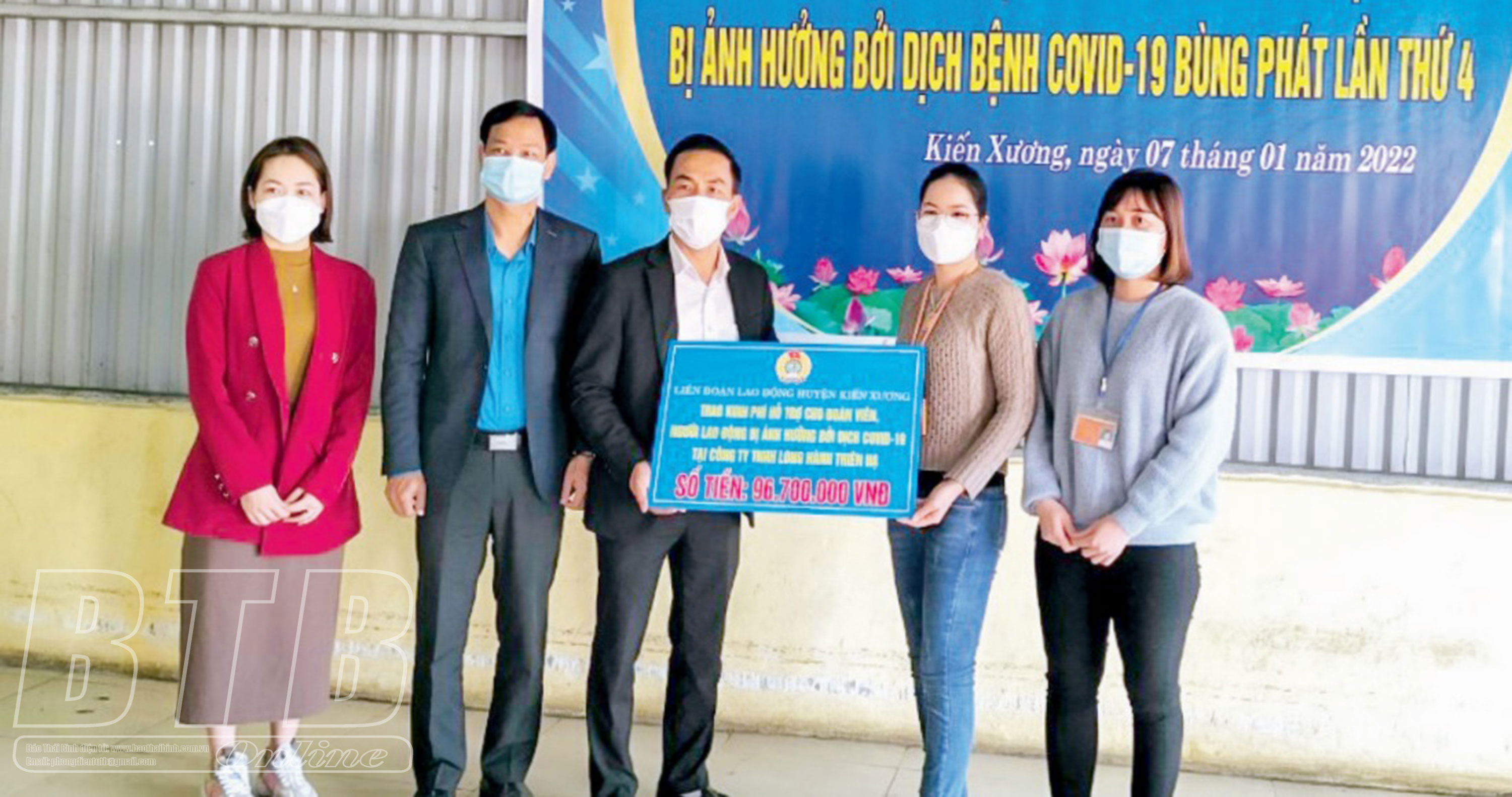 Liên đoàn Lao động huyện Kiến Xương trao kinh phí hỗ trợ đoàn viên bị ảnh hưởng bởi dịch Covid-19 tại Công ty TNHH Long Hành Thiên Hạ.