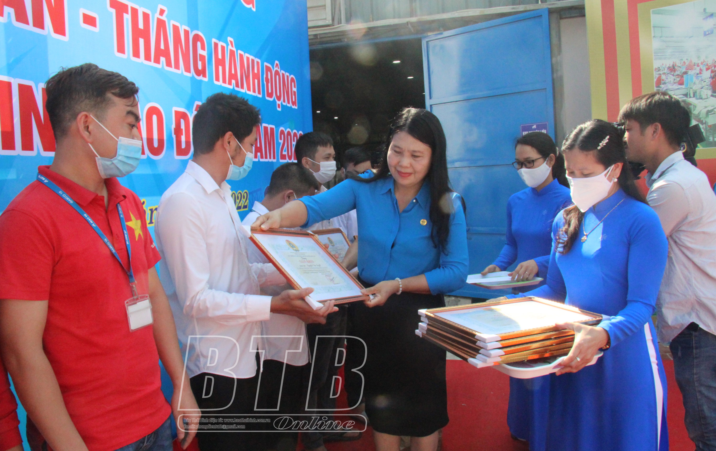Tại lễ phát động, LĐLĐ tỉnh trao 100 mũ bảo hiểm xe máy cho công nhân lao động bị ảnh hưởng bởi dịch Covid-19; LĐLĐ huyện Hưng Hà tổ chức khen thưởng cho 20 công nhân tiêu biểu xuất sắc trong phong trào thi đua “Lao động giỏi, lao động sáng tạo” và trao 100 suất quà cho công nhân vượt khó vươn lên trong lao động với trị giá trên 30 triệu đồng.