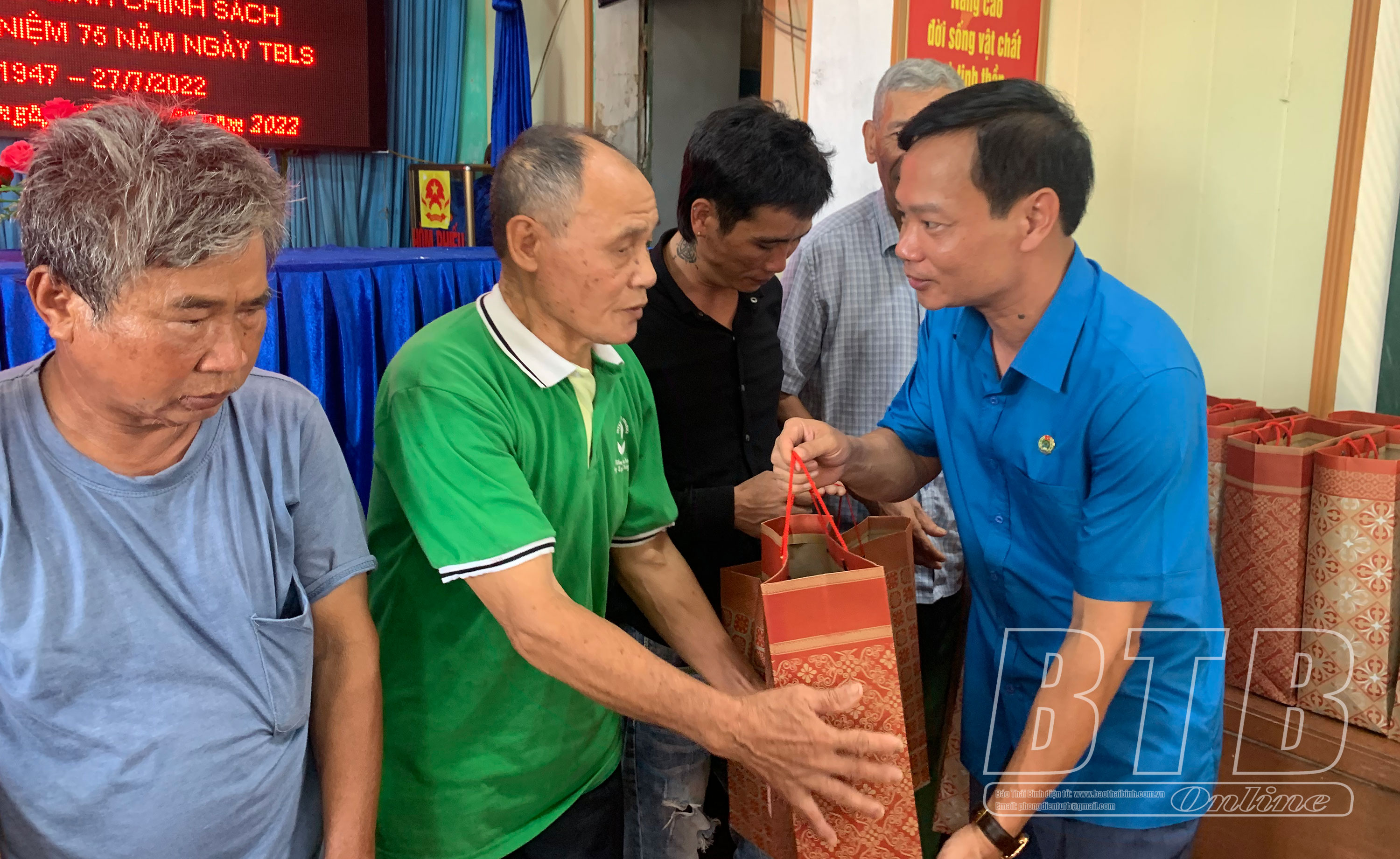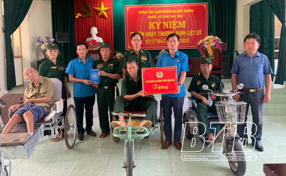 Nhân dịp này, LĐLĐ tỉnh cũng tổ chức thăm và trao tặng 20 suất quà (mỗi suất trị giá 500.000 đồng) cho cho các thương binh, bệnh binh đang được nuôi dưỡng, chăm sóc tại Trung tâm Chăm sóc và Phục hồi chức năng cho người tâm thần tại xã Đông Kinh (Đông Hưng); các thương binh, bệnh bệnh, người có công và thân nhân người có công tại xã Quỳnh Ngọc (Quỳnh Phụ); trao tặng 18 suất cho gia đình cán bộ công đoàn chuyên trách có bố, mẹ là thương binh, bệnh binh trên địa bàn tỉnh.