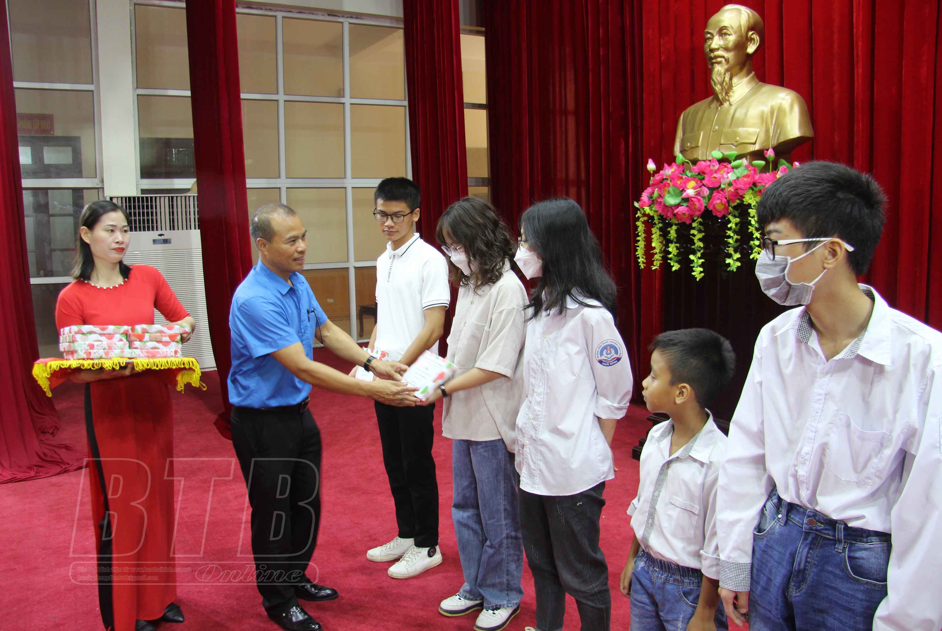 Đại diện lãnh đạo Liên đoàn Lao động tỉnh và UBND huyện Tiền Hải trao thưởng cho các em học sinh là con đoàn viên, công nhân, viên chức, người lao động đạt thành tích xuất sắc trong học tập.