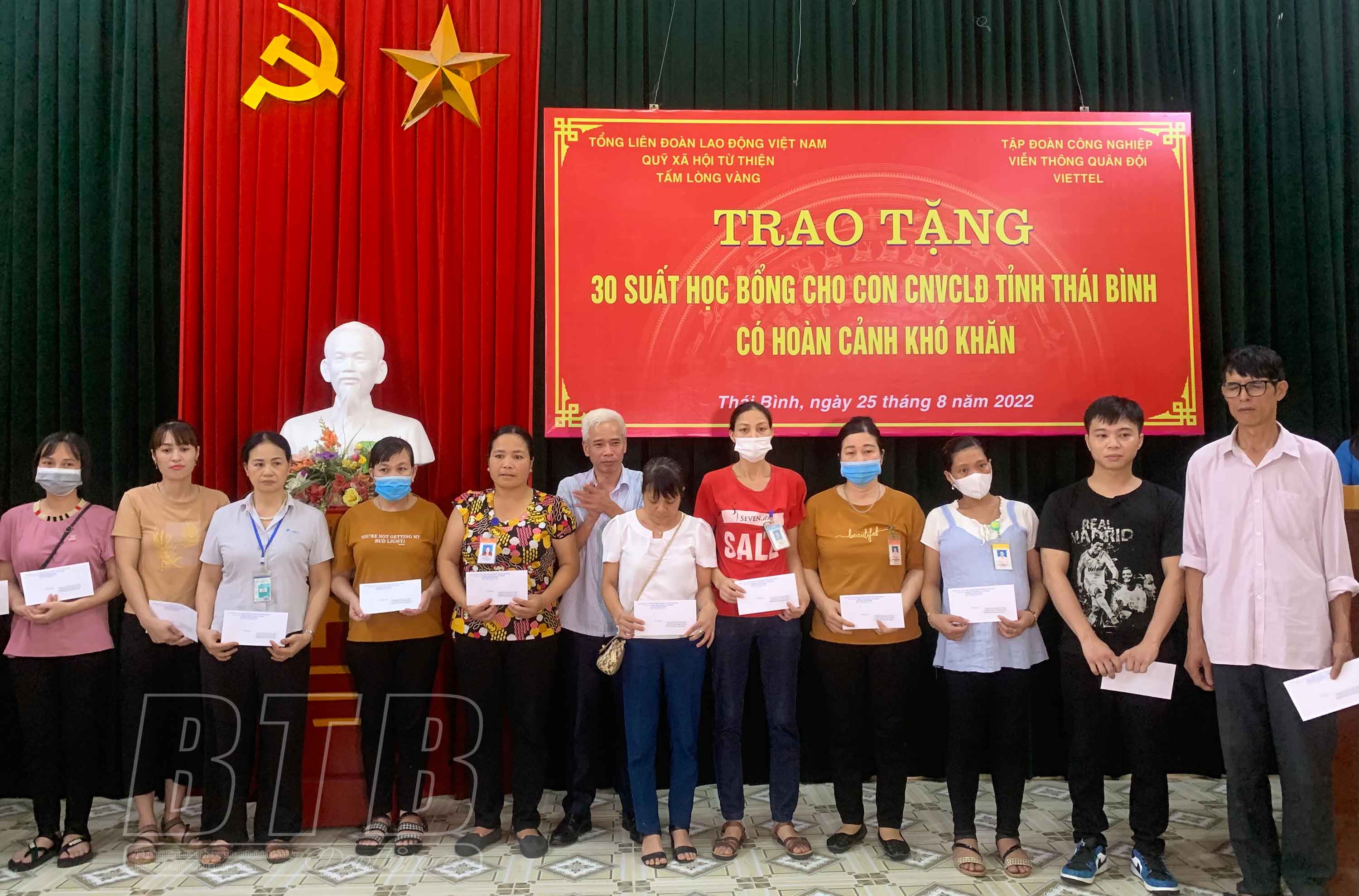 Sáng ngày 25/8, Liên đoàn Lao động tỉnh tổ chức trao 30 suất học bổng cho con công nhân lao động có hoàn cảnh khó khăn vượt khó vươn lên trong học tập. Mỗi suất học bổng có trị giá 1 triệu đồng từ nguồn tài trợ của Tập đoàn Công nghiệp - Viễn thông Quân đội (Viettel).