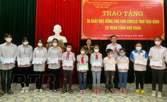 Lãnh đạo Liên đoàn Lao động tỉnh và Viettel Thái Bình trao học bổng cho các cháu.