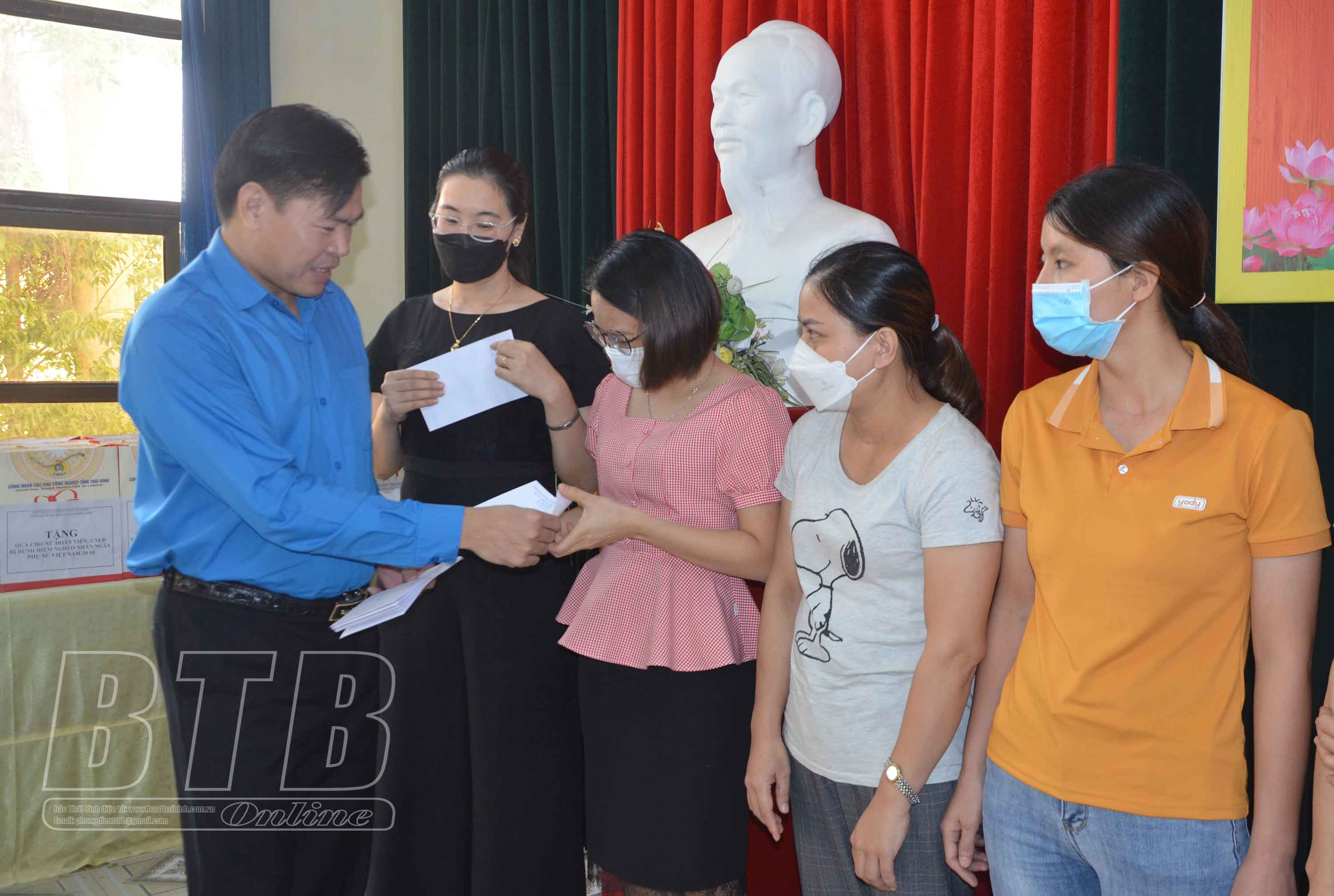 Lãnh đạo Liên đoàn Lao động tỉnh; Ban Quản lý Khu kinh tế và các khu công nghiệp tỉnh trao quà cho đoàn viên nữ mắc bệnh hiểm nghèo.