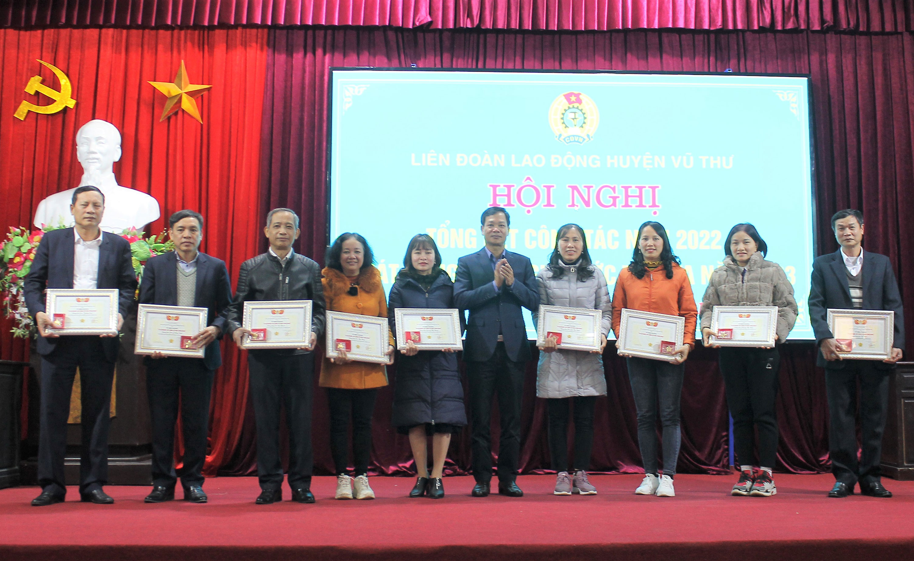 Nhân dịp này, lãnh đạo LĐLĐ tỉnh, HĐND, UBND huyện đã trao cờ thi đua, bằng khen, giấy khen của LĐLĐ các cấp cho các tập thể, cá nhân tiêu biểu và trao kỷ niệm chương của Tổng LĐLĐ Việt Nam cho 14 cá nhân.