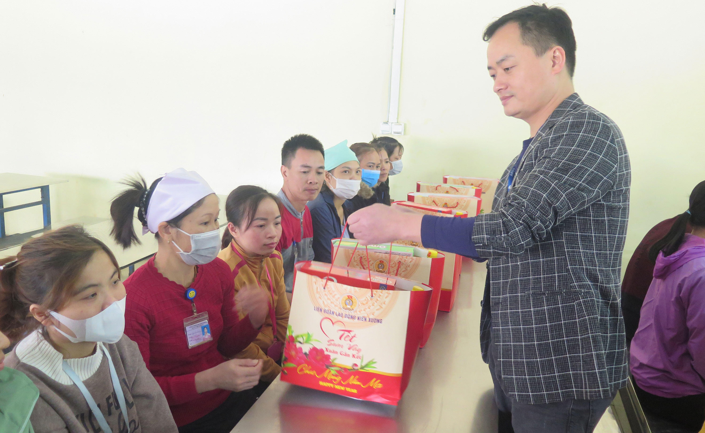 Lãnh đạo Công ty TNHH Long Hành Thiên Hạ trao quà cho công nhân.