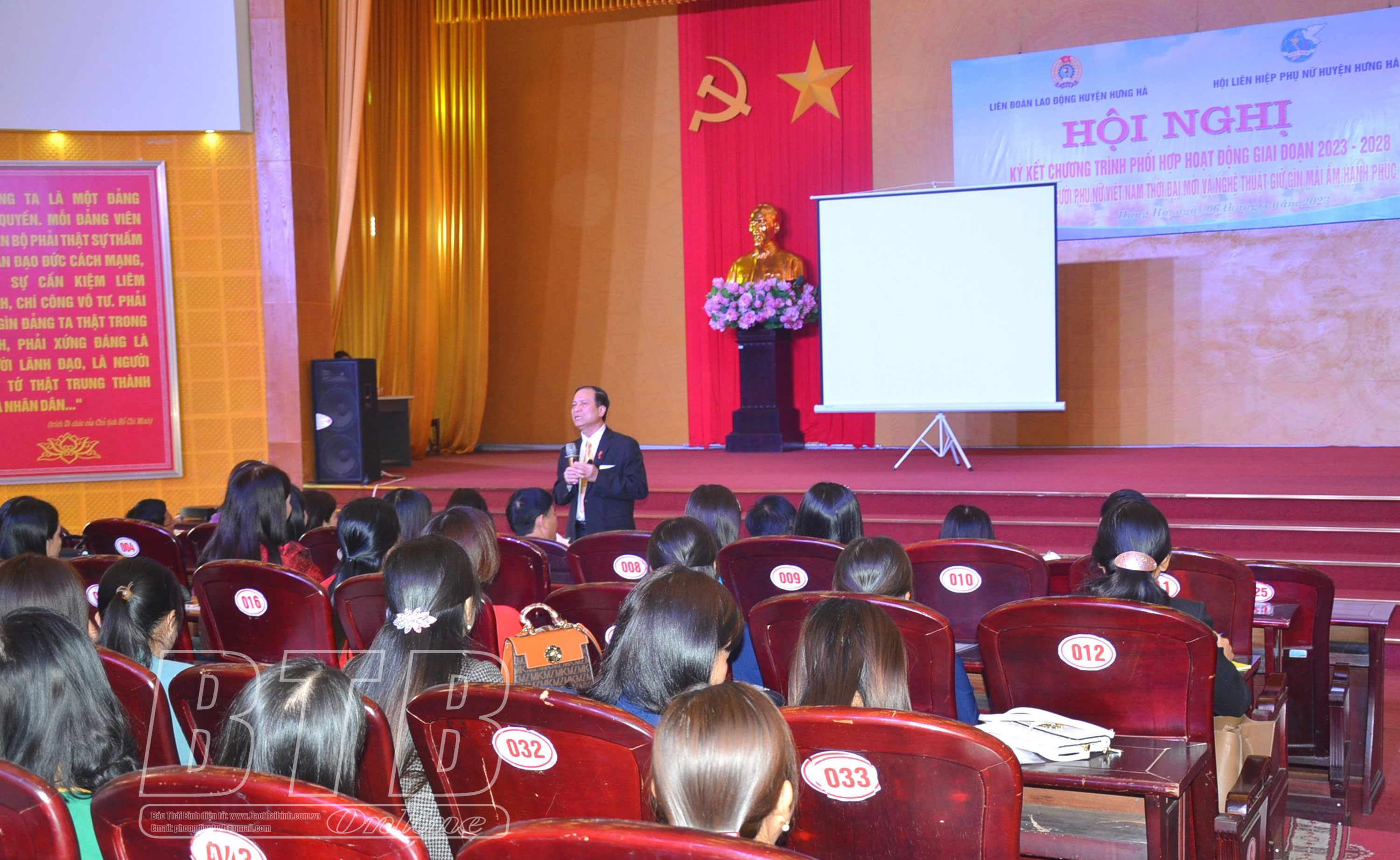 Tại hội nghị, các đại biểu đã nghe bác sĩ Mai Xuân Phương, nguyên Phó Vụ trưởng Vụ Truyền thông - Giáo dục (Tổng cục Dân số Bộ Y tế) chia sẻ, trao đổi những kiến thức xây dựng người phụ nữ Việt Nam thời đại mới và nghệ thuật giữ gìn mái ấm hạnh phúc gia đình; cán bộ, hội viên phụ nữ trong huyện hưởng ứng “Tuần lễ áo dài Việt Nam” năm 2023.