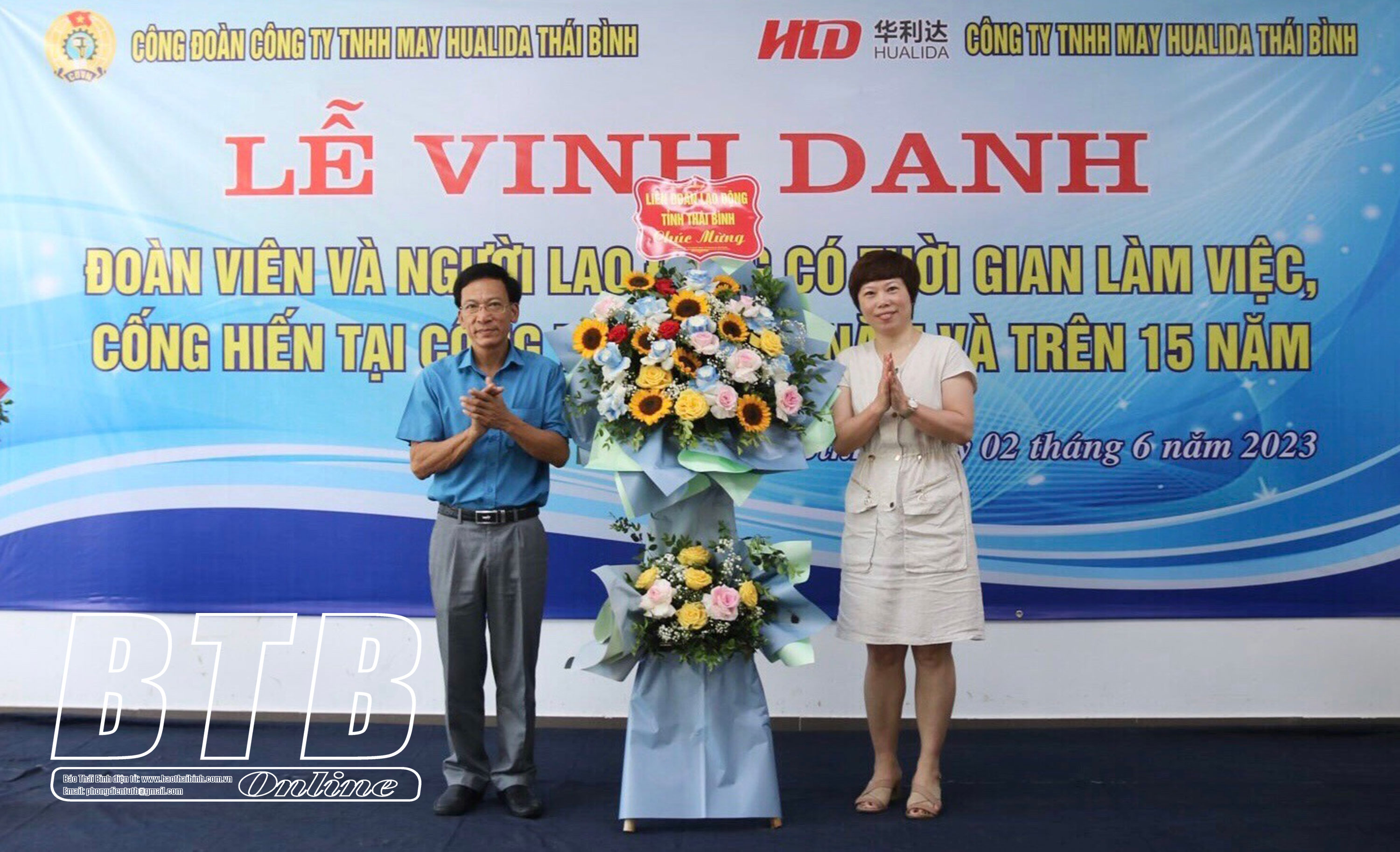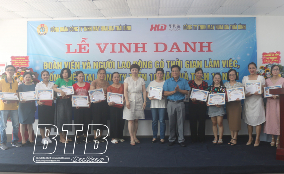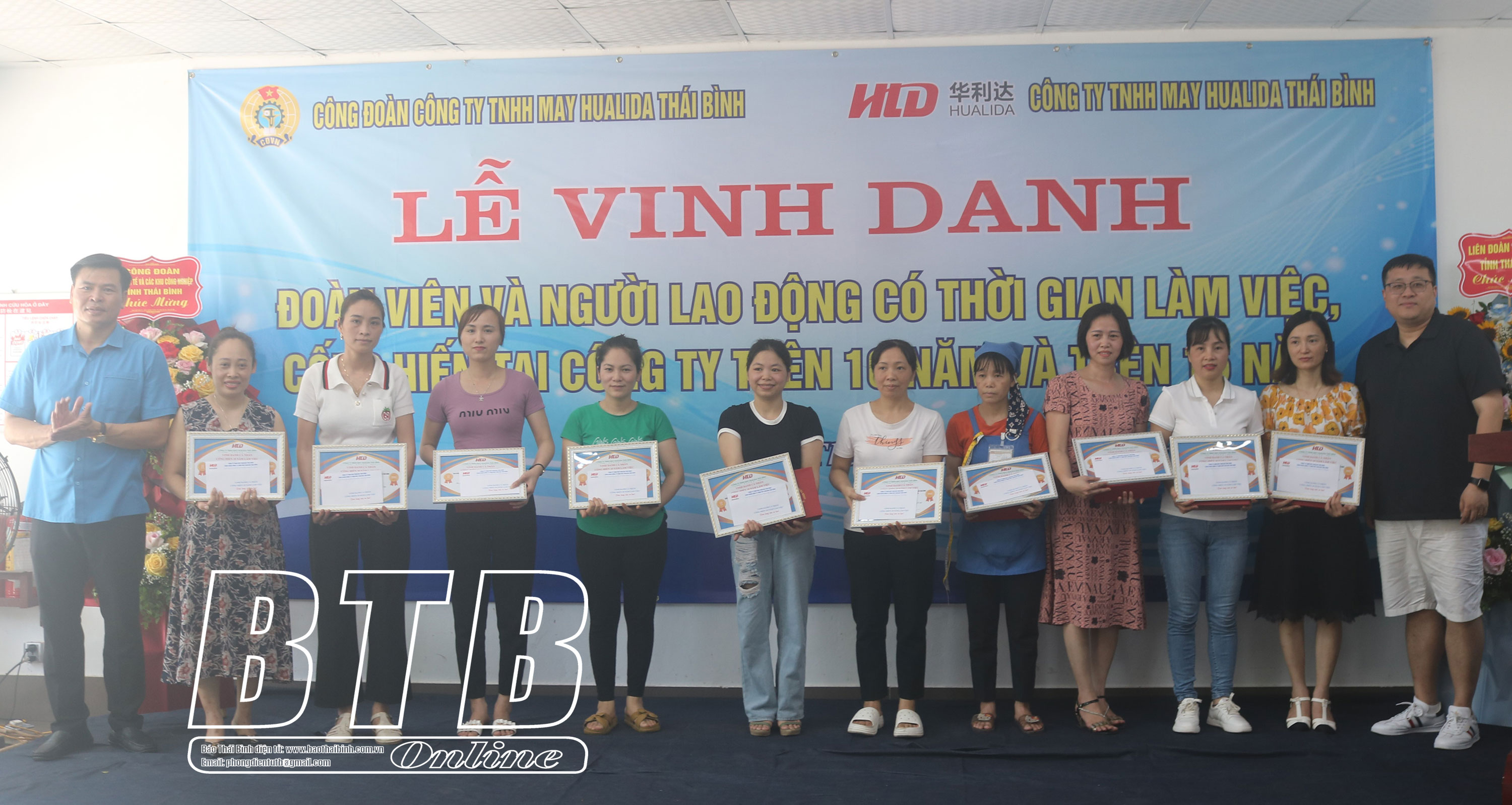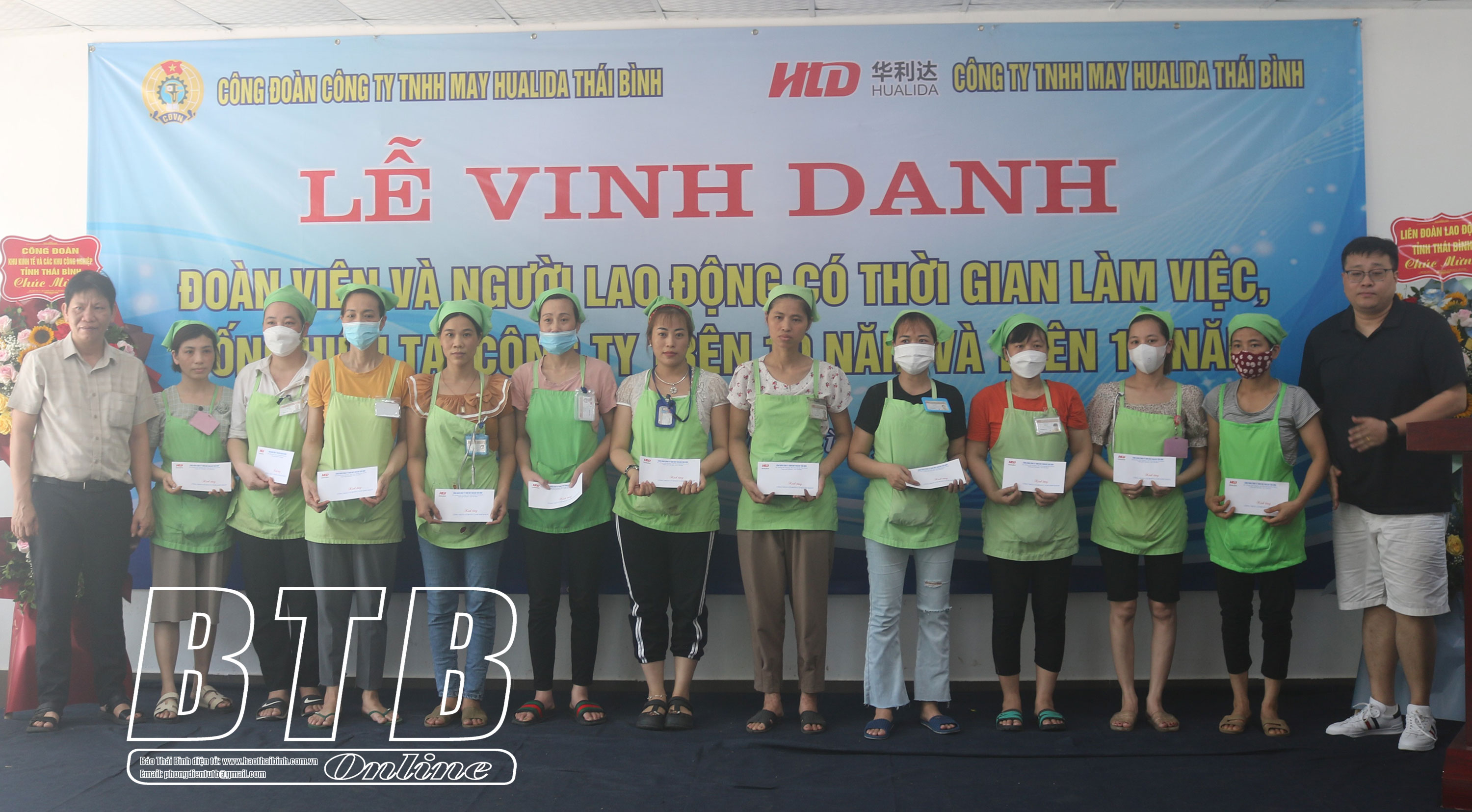 Đoàn viên, người lao động có thời gian làm việc, cống hiến trên 15 năm tại Công ty TNHH May Hualida Thái Bình được vinh danh, khen thưởng.