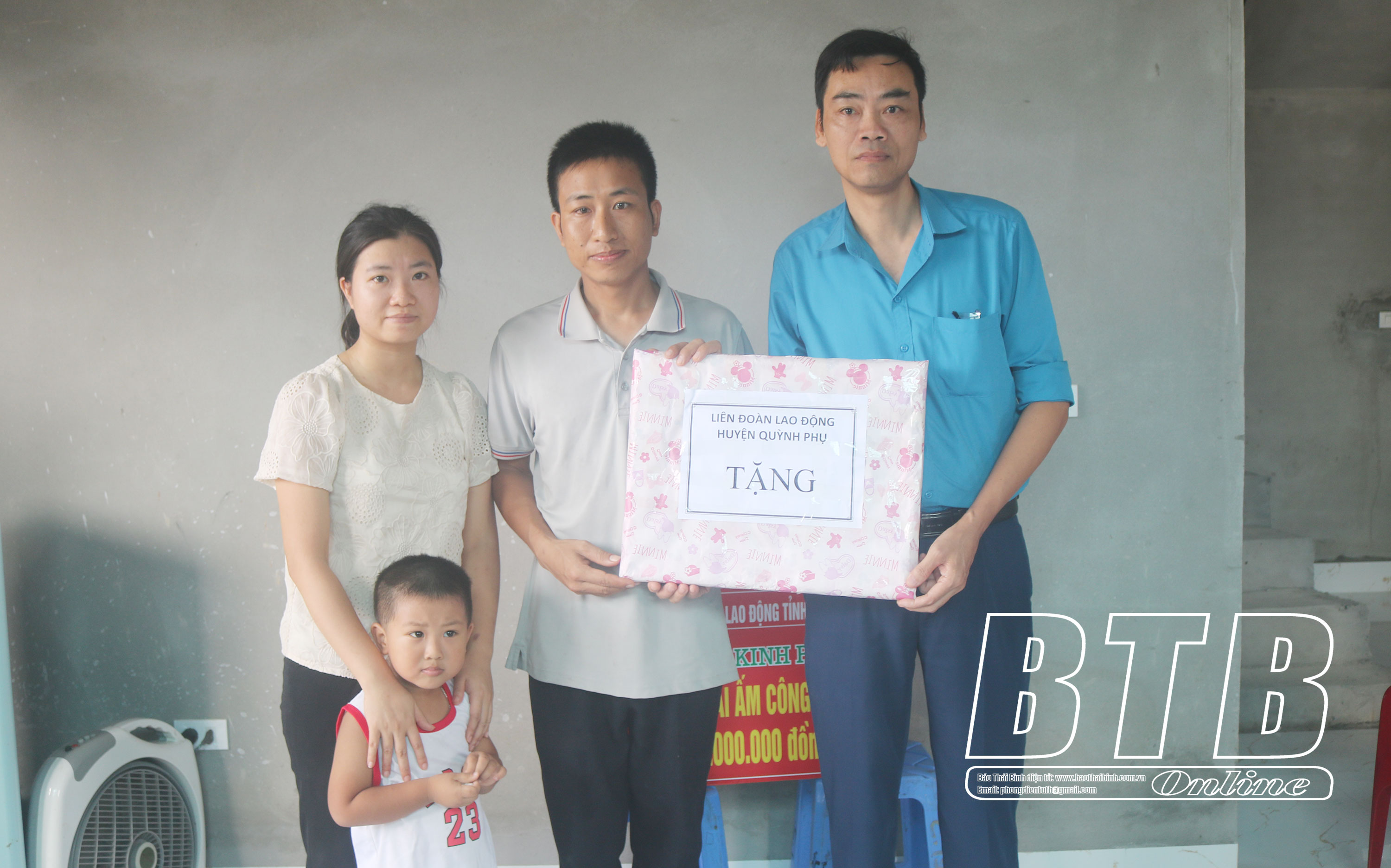 Đại diện Liên đoàn Lao động huyện Quỳnh Phụ trao quà cho gia đình anh Nguyễn Hữu Độ.