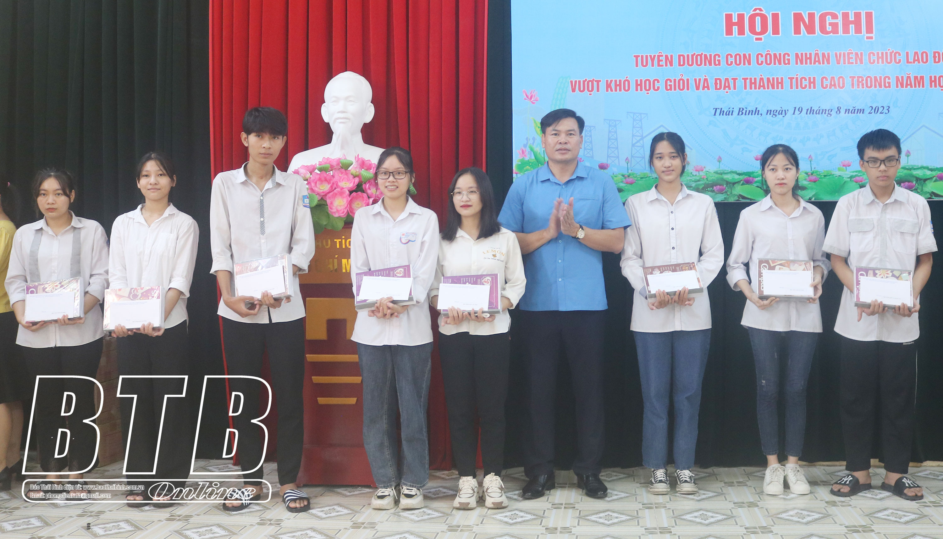 Lãnh đạo Liên đoàn Lao động tỉnh trao thưởng cho các cháu học sinh đạt thành tích cao trong học tập.