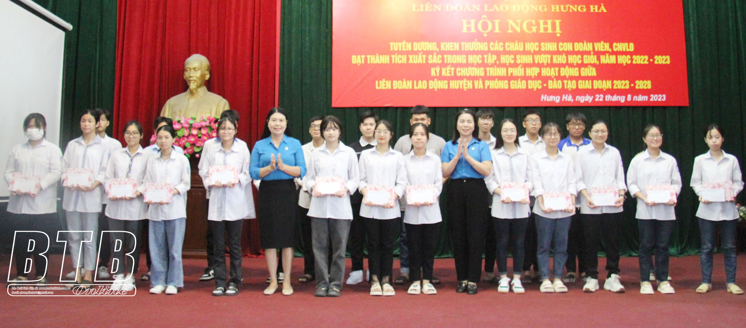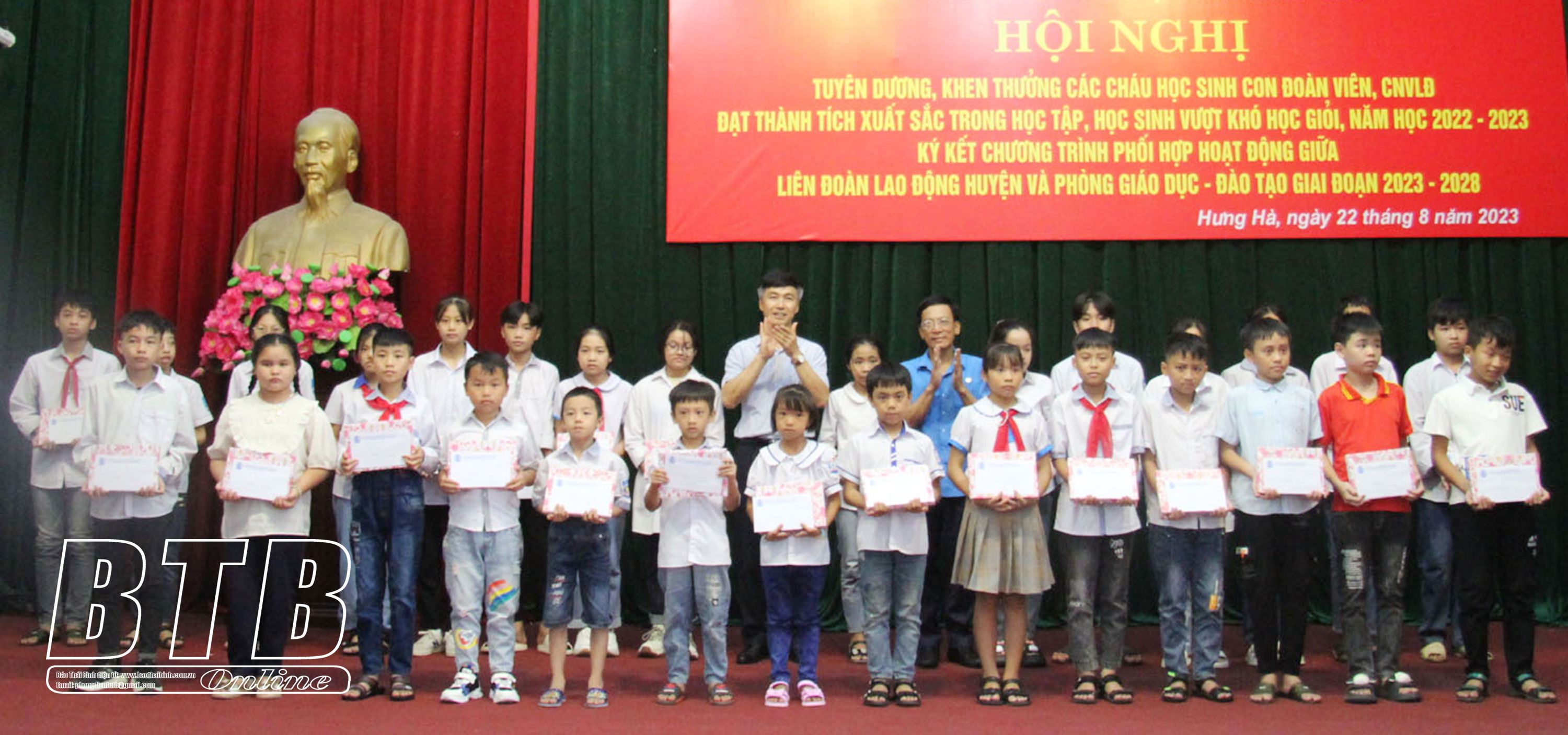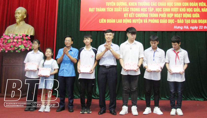 Năm học 2022 - 2023, huyện Hưng Hà có 3.500 học sinh là con đoàn viên, công nhân viên chức, người lao động đang theo học từ lớp 1 đến lớp 12. Trong đó, có 2.664 học sinh đạt thành tích cao trong học tập, gồm: 6 học sinh đạt giải quốc gia, 85 học sinh giỏi cấp tỉnh, 203 học sinh giỏi cấp huyện, 652 lượt học sinh giỏi các kỳ thi trên mạng, 753 học sinh giỏi cấp trường và 965 học sinh tiên tiến.