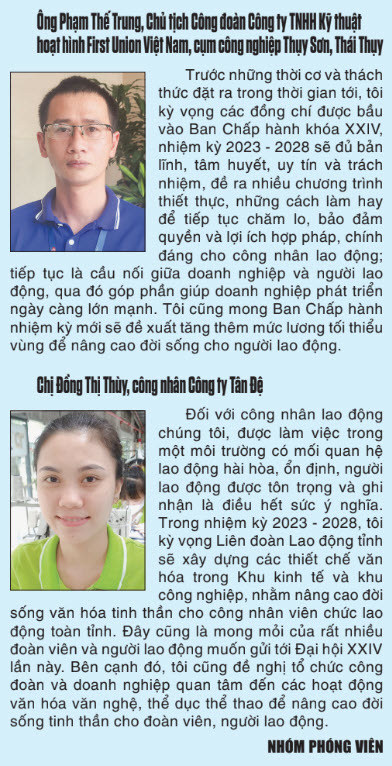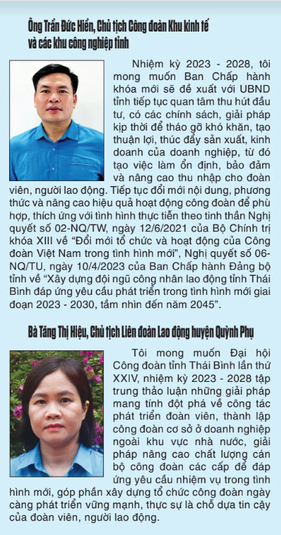 Những năm tới, tổ chức và hoạt động công đoàn sẽ còn gặp không ít khó khăn, thách thức. Trước yêu cầu hoạt động công đoàn trong tình hình mới, để góp phần thực hiện thắng lợi Nghị quyết Đại hội Đảng bộ tỉnh lần thứ XX, mục tiêu trọng tâm đặt ra trong nhiệm kỳ tới là xây dựng tổ chức công đoàn vững mạnh toàn diện; tập hợp, thu hút, củng cố, tăng cường niềm tin của đoàn viên, NLĐ vào tổ chức công đoàn; thực hiện tốt chức năng đại diện, bảo vệ quyền, lợi ích hợp pháp, chính đáng của đoàn viên, NLĐ; xây dựng đội ngũ công nhân lao động hiện đại, lớn mạnh, góp phần đưa Thái Bình thành tỉnh phát triển trong khu vực đồng bằng sông Hồng.