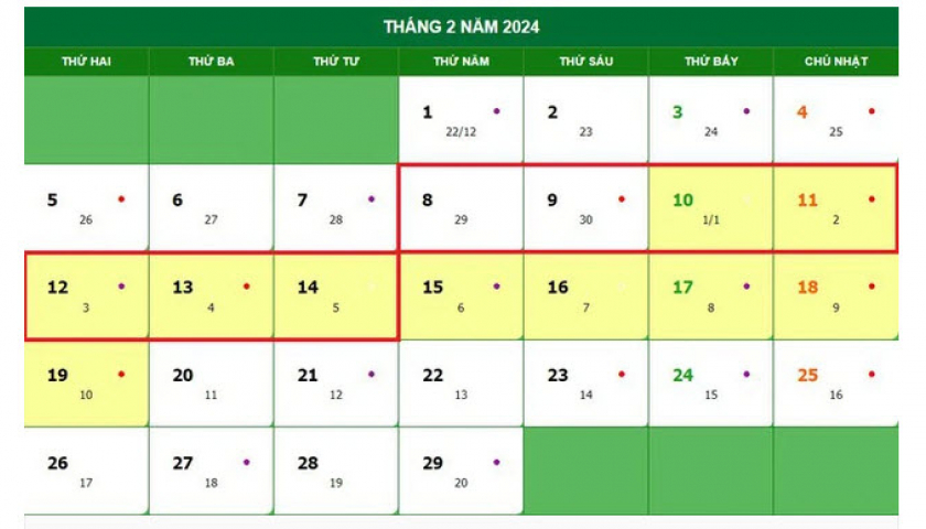 Phương án 1: Công chức, viên chức nghỉ 2 ngày trước Tết, 3 ngày sau Tết và 2 ngày nghỉ bù do trùng với cuối tuần. Bắt đầu từ thứ Năm ngày 8/2/2024 đến hết thứ Tư ngày 14/2/2024 Dương lịch (tức ngày 29 tháng Chạp năm Quý Mão đến hết ngày mùng 5 tháng Giêng năm Giáp Thìn).