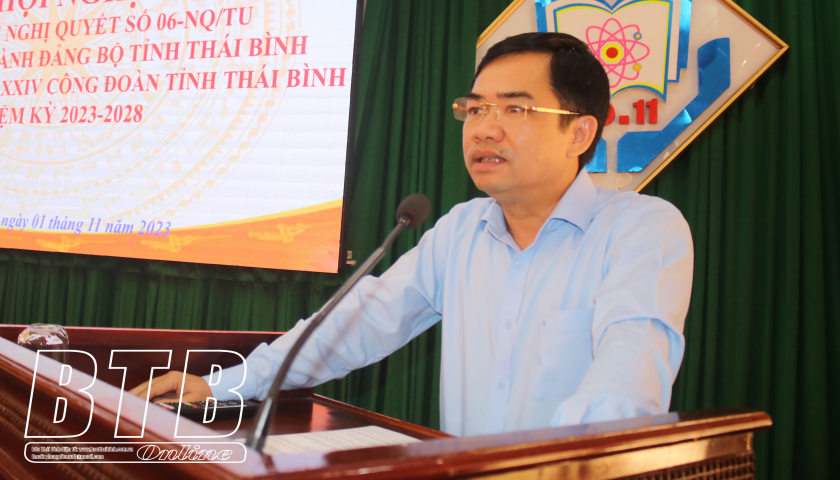 Các đại biểu đã nghe lãnh đạo Liên đoàn Lao động tỉnh quán triệt, phổ biến một số nội dung cơ bản của Nghị quyết số 06-NQ/TU như: nguyên nhân và tình hình phát triển của đội ngũ công nhân lao động tỉnh Thái Bình; quan điểm, mục tiêu và tầm nhìn; một số nhiệm vụ và giải pháp xây dựng đội ngũ công nhân lao động trên địa bàn tỉnh đáp ứng yêu cầu phát triển trong tình hình mới. Các đại biểu được thông tin về các chỉ tiêu phấn đấu của Công đoàn tỉnh như: tăng thêm 60.000 đoàn viên công đoàn trong nhiệm kỳ 2023 – 2028; 90% trở lên doanh nghiệp đủ điều kiện thành lập được tổ chức công đoàn cơ sở…
