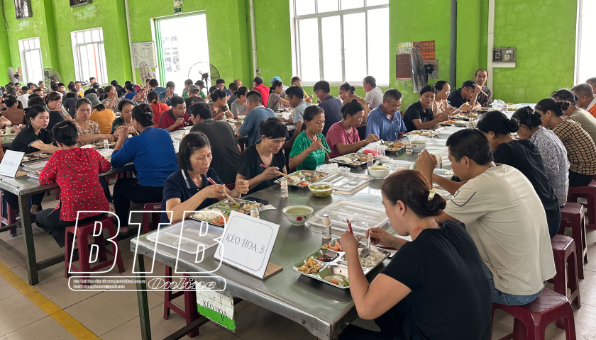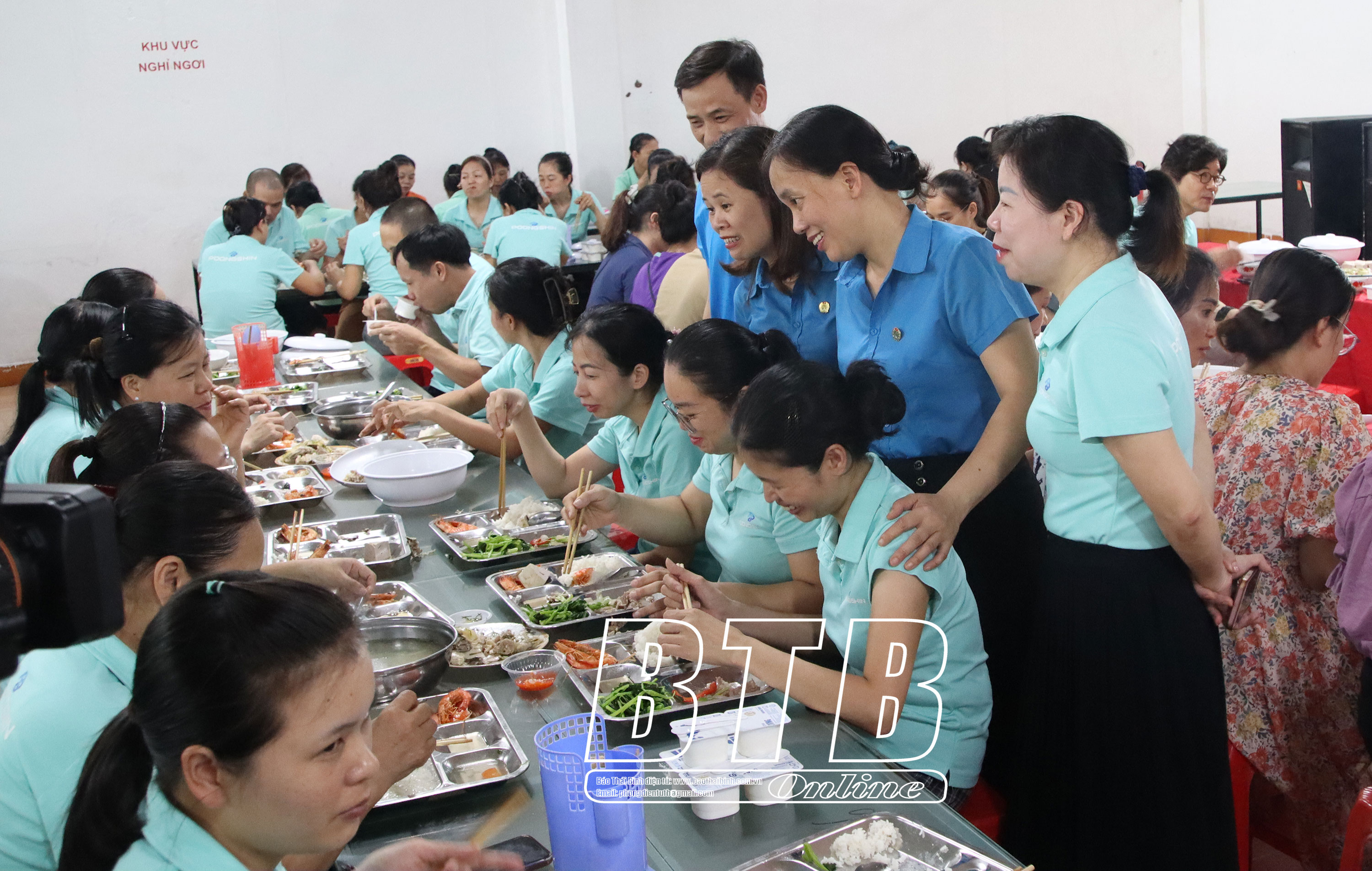 Lãnh đạo, cán bộ công đoàn các cấp thăm hỏi, trò chuyện cùng đoàn viên, người lao động Công ty TNHH Poong Shin Vina (khu công nghiệp Phúc Khánh, thành phố Thái Bình) tại bữa cơm công đoàn.