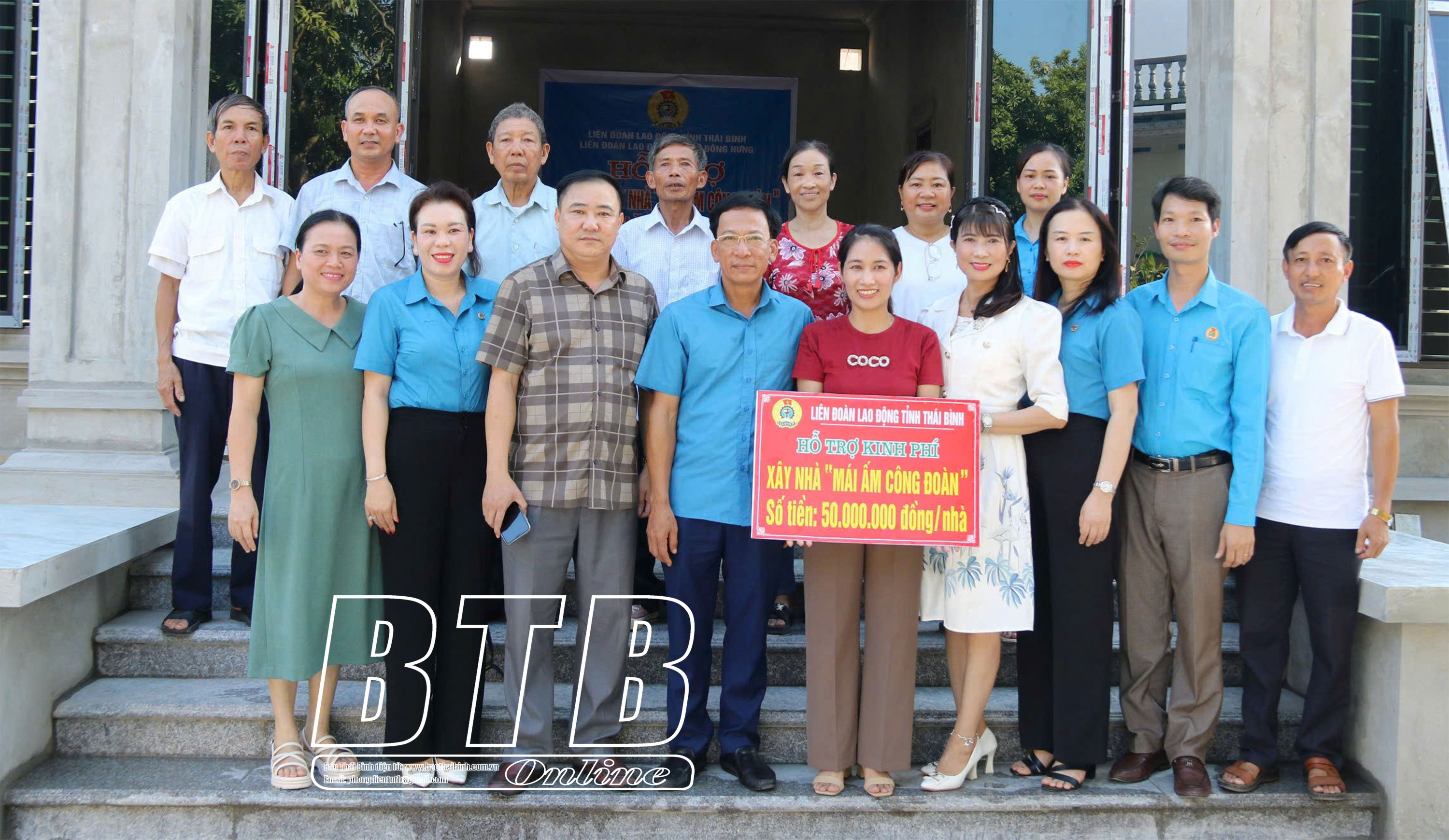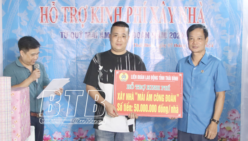 Lãnh đạo Liên đoàn Lao động tỉnh, huyện Đông Hưng trao kinh phí hỗ trợ xây nhà mái ấm công đoàn cho cô giáo Nguyễn Trang Nhung, đoàn viên công đoàn Trường Mầm non An Châu (Đông Hưng).