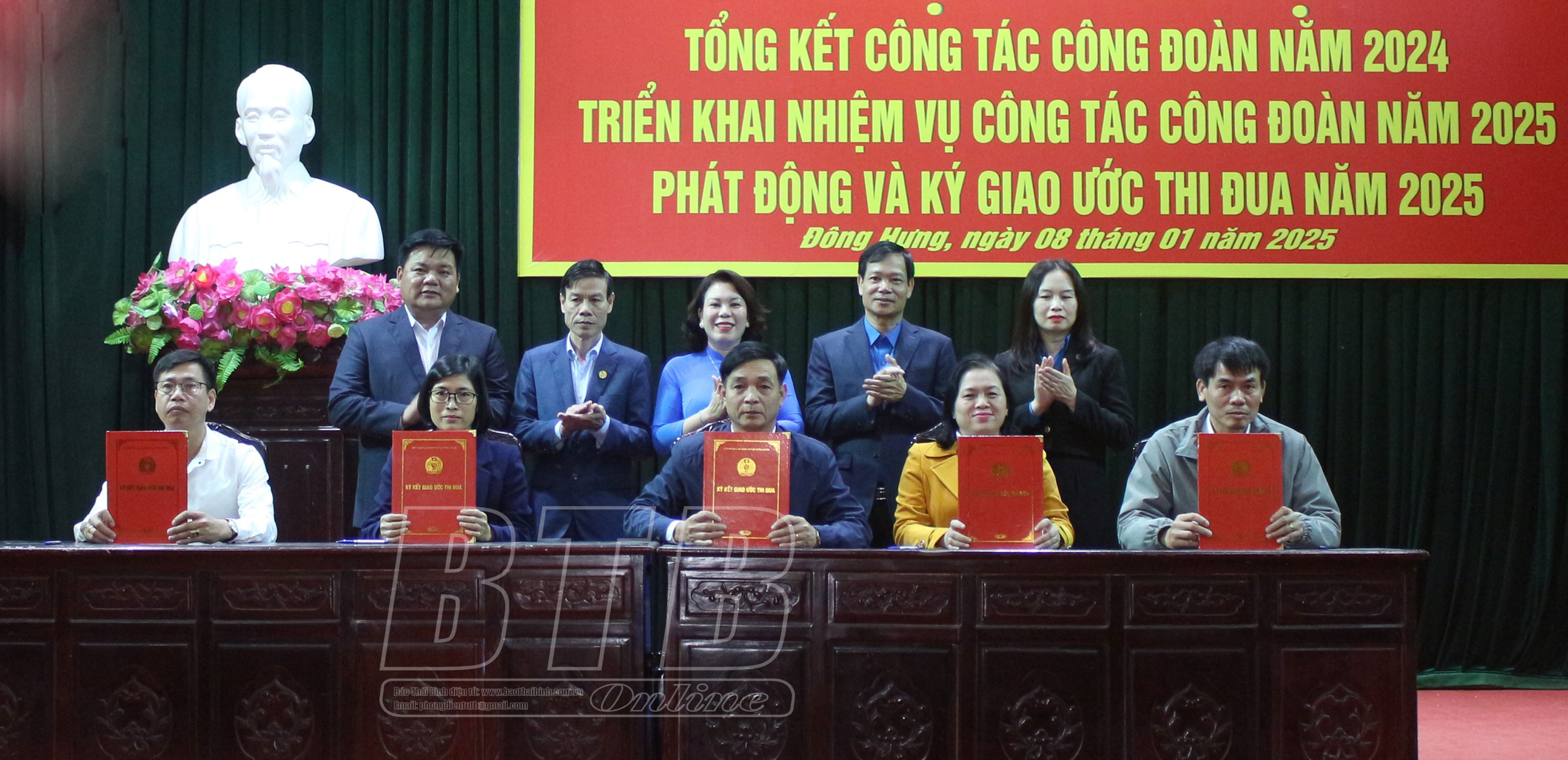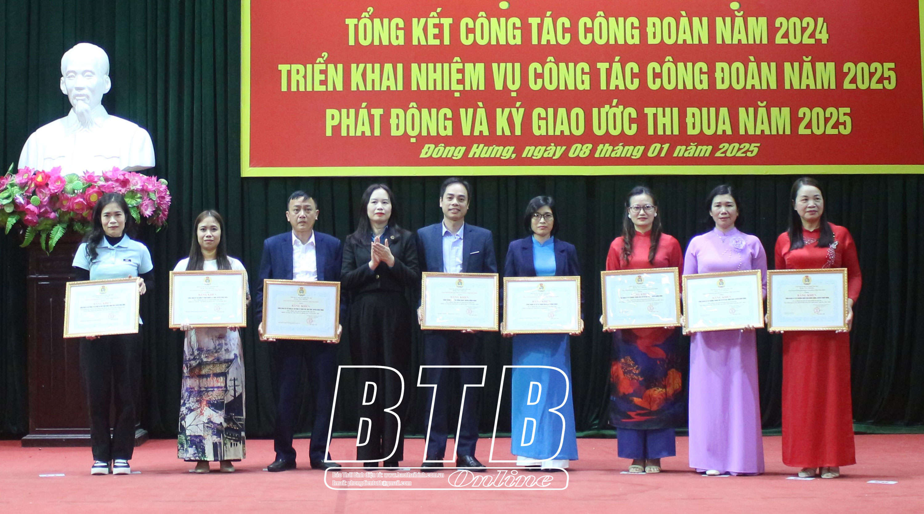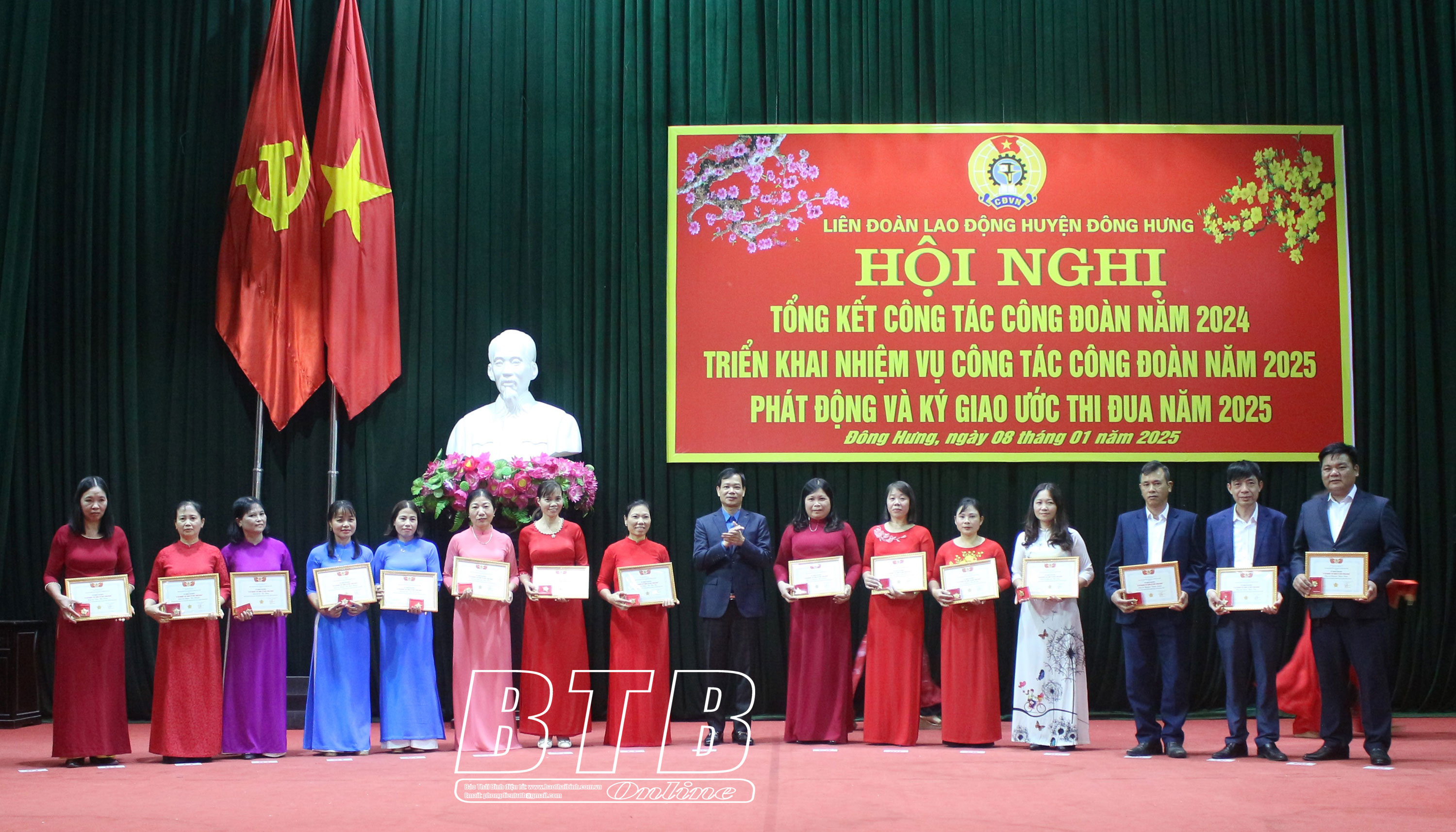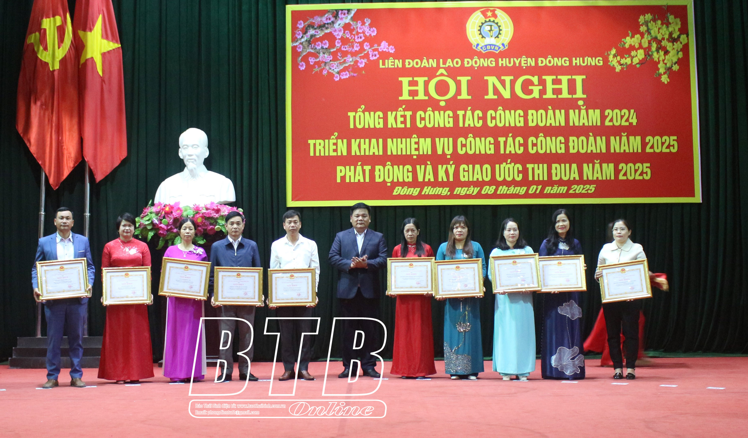 Năm 2025, LĐLĐ huyện Đông Hưng tiếp tục đổi mới nội dung và phương thức hoạt động công đoàn theo hướng vì đoàn viên và người lao động, vì sự phát triển bền vững của tổ chức công đoàn; thực hiện tốt chức năng chăm lo đời sống, bảo vệ quyền, lợi ích hợp pháp, chính đáng của đoàn viên và người lao động; nâng cao chất lượng công tác tuyên truyền, vận động, giáo dục và tổ chức phong trào thi đua yêu nước trong đoàn viên và người lao động; đẩy mạnh phát triển đoàn viên, xây dựng đội ngũ cán bộ công đoàn và tổ chức công đoàn vững mạnh. Nhân dịp này, 175 tập thể, cá nhân có thành tích xuất sắc trong công tác công đoàn năm 2024 được biểu dương, khen thưởng.