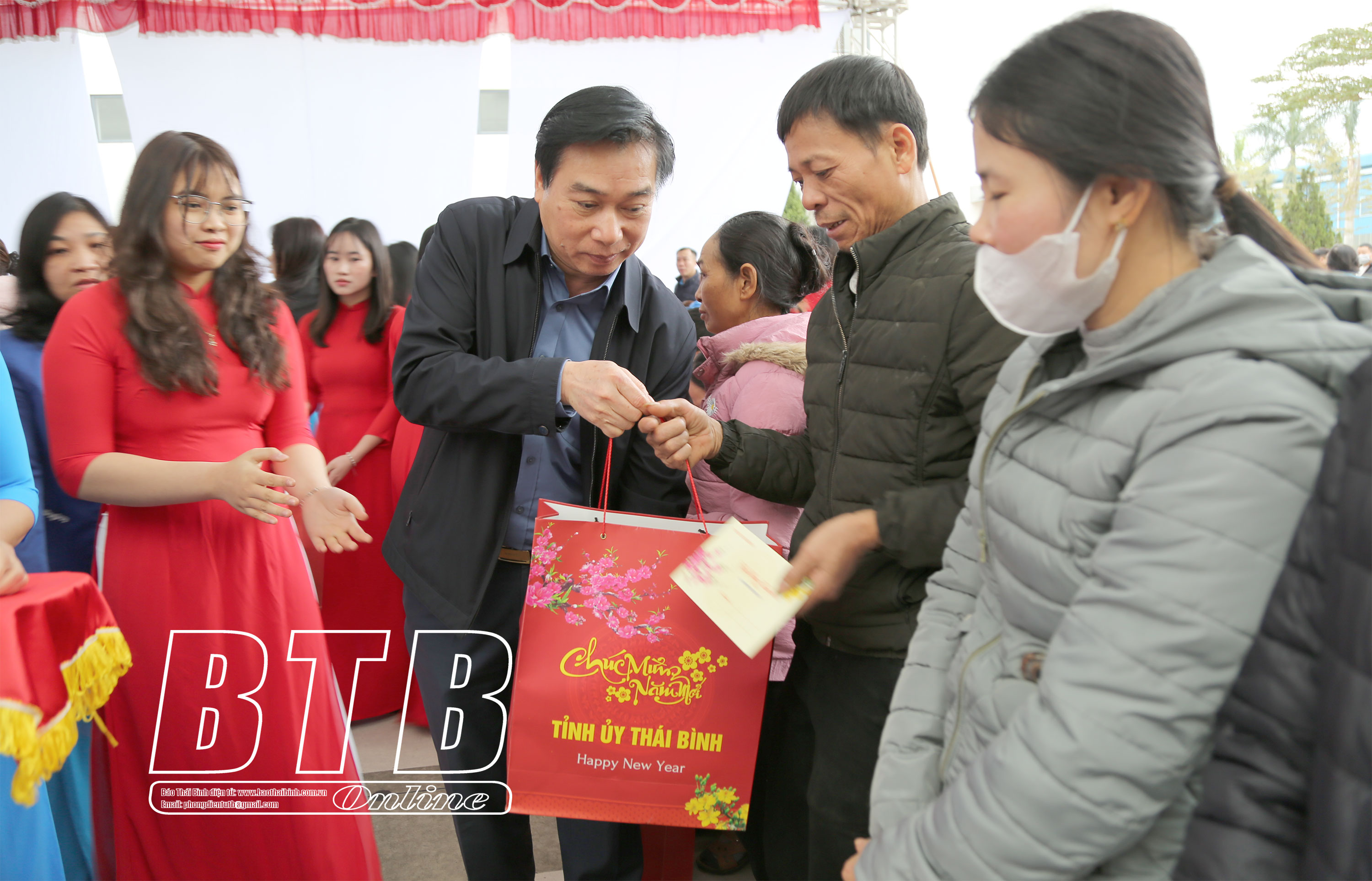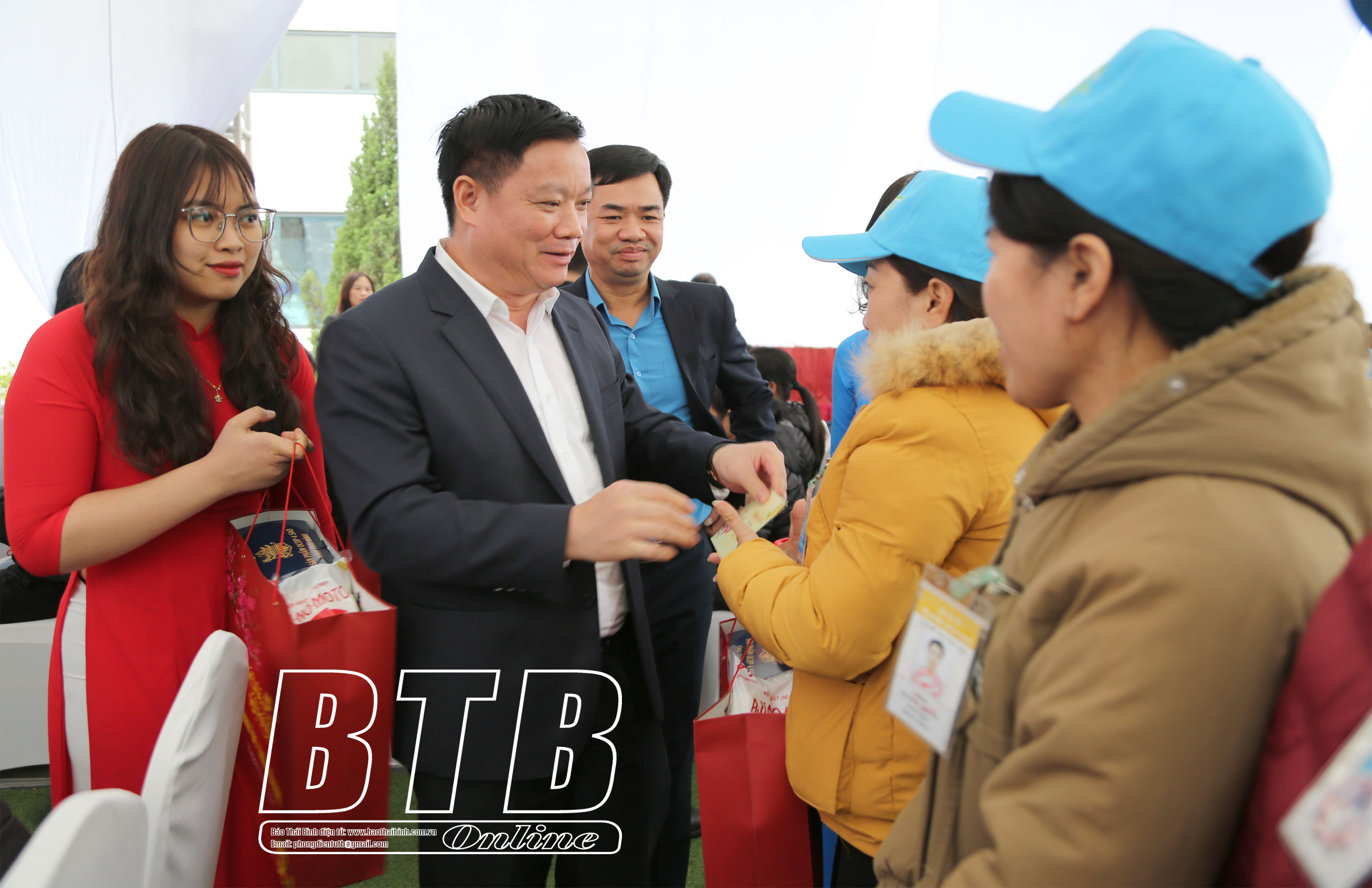 Đồng chí Nguyễn Khắc Thận, Bí thư Tỉnh ủy, Chủ tịch UBND tỉnh tặng quà tết công nhân khu công nghiệp Phúc Khánh (thành phố Thái Bình).