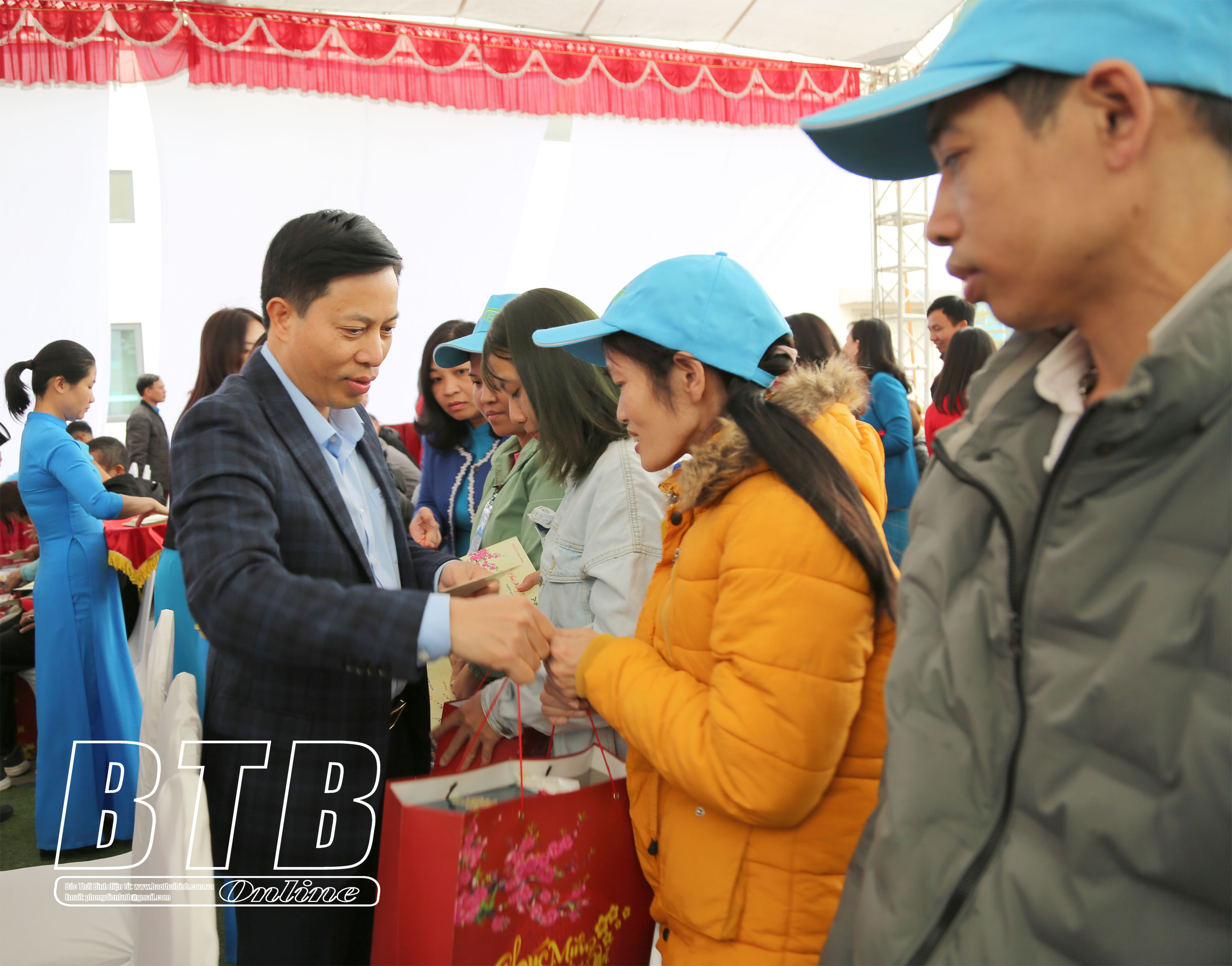 Đồng chí Vũ Kim Cứ, Ủy viên Ban Thường vụ Tỉnh ủy, Trưởng ban Quản lý Khu kinh tế và các khu công nghiệp tỉnh tặng quà tết động viên công nhân khu công nghiệp Phúc Khánh.