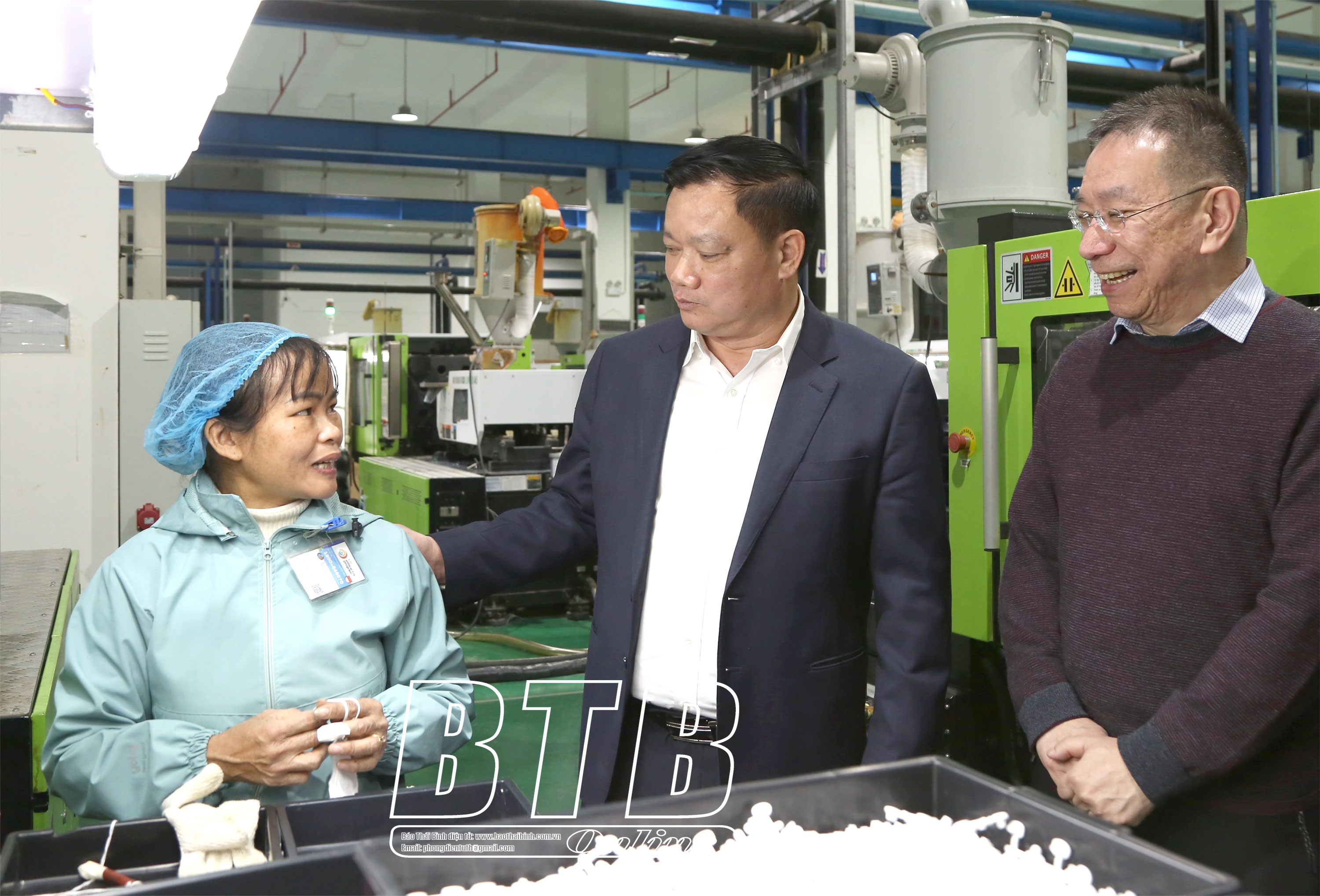 Đồng chí Nguyễn Khắc Thận, Bí thư Tỉnh ủy, Chủ tịch UBND tỉnh kiểm tra sản xuất, động viên công nhân Công ty TNHH Nhựa Cotec (khu công nghiệp Phúc Khánh).