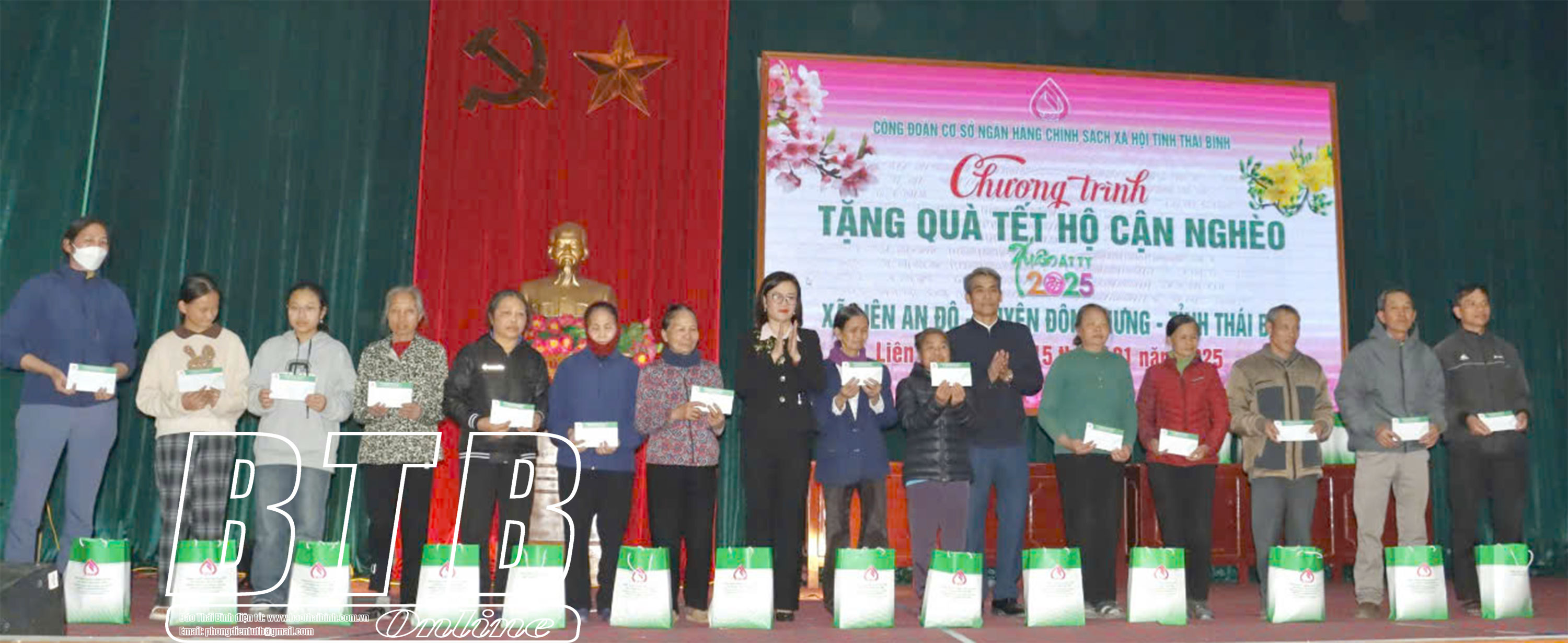 Lãnh đạo huyện Đông Hưng và Phòng Giao dịch Ngân hàng Chính sách xã hội huyện Đông Hưng trao quà cho các hộ cận nghèo xã Liên An Đô.