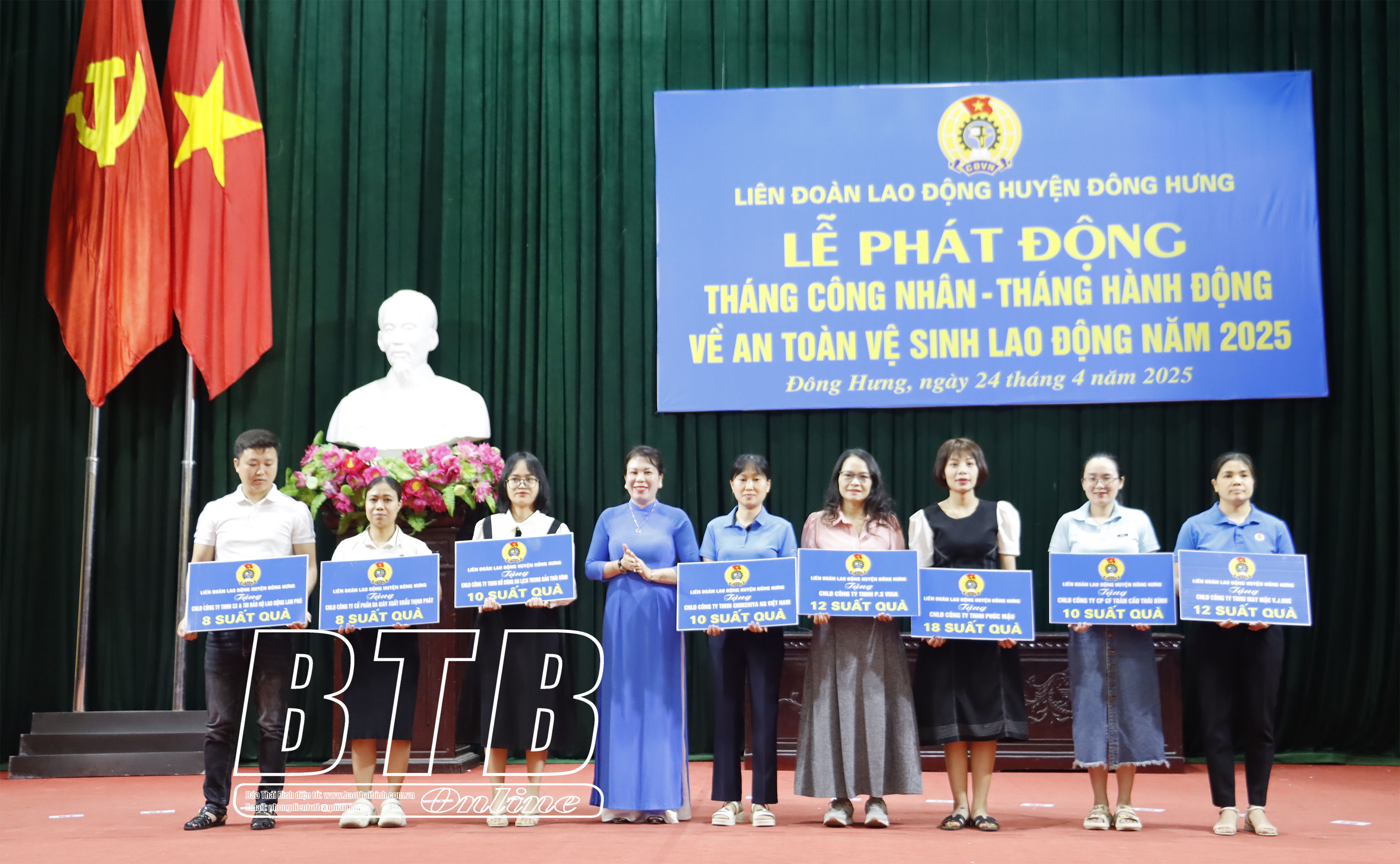 Nhân dịp này, LĐLĐ huyện Đông Hưng khen thưởng 28 đoàn viên, công nhân, người lao động tiêu biểu, xuất sắc trong lao động sản xuất; đồng thời trao 158 suất quà “Tình nghĩa tháng 5” cho đoàn viên, công nhân, người lao động có hoàn cảnh khó khăn với tổng số tiền trên 90 triệu đồng.