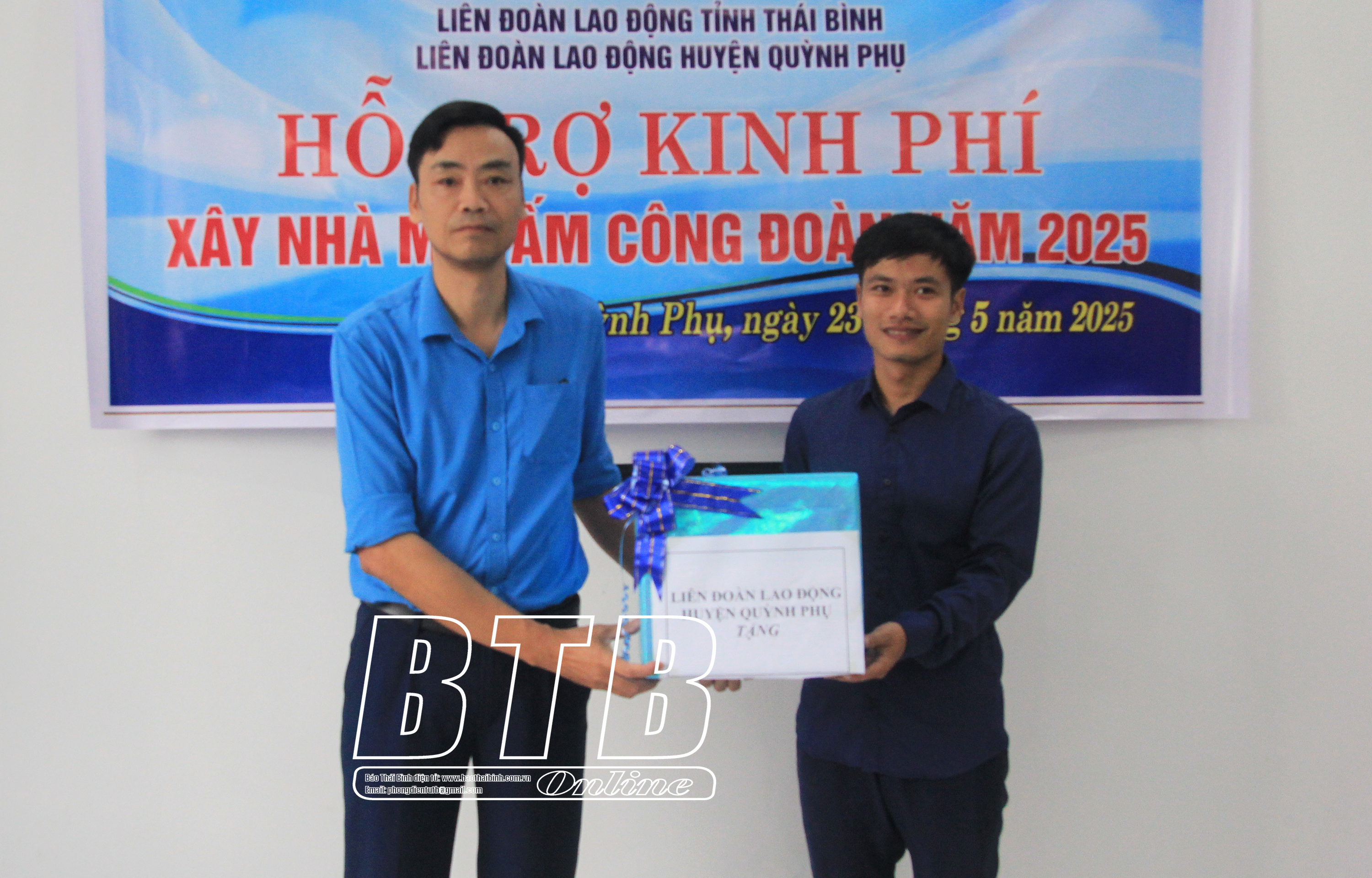 Lãnh đạo Liên đoàn Lao động huyện Quỳnh Phụ trao kinh phí hỗ trợ xây nhà mái ấm công đoàn cho chị Nguyễn Thị Dinh, đoàn viên công đoàn Trường Mầm non Đông Hải.