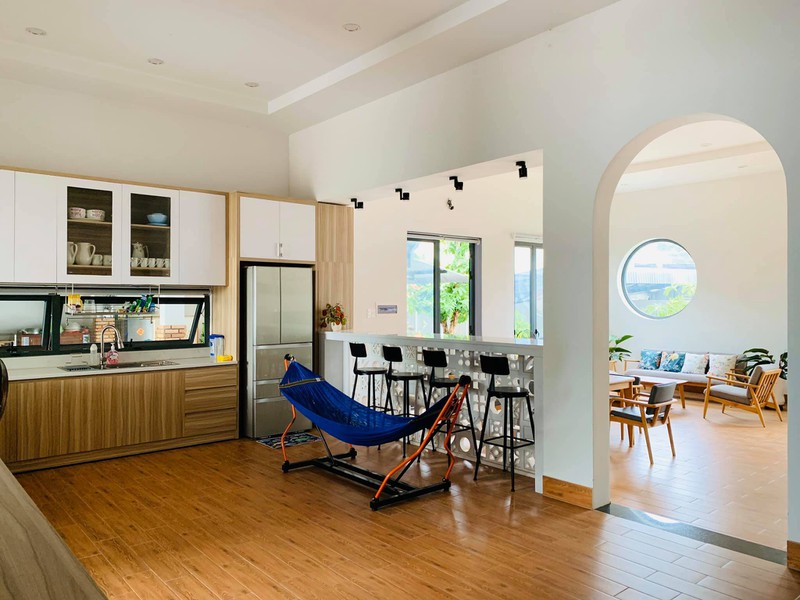 Ngôi nhà có 2 phòng bếp. Phòng bếp bên trong mang phong cách hiện đại với tủ bếp gỗ kịch trần - cất giấu mọi đồ nấu nướng thật gọn gàng, dùng bếp từ. Phòng bếp thứ 2 có không gian mở, với bàn đảo xây và ốp bằng gạch đỏ truyền thống, dùng bếp ga. Mỗi gian bếp phục vụ cho các nhu cầu khác nhau của gia đình đông thành viên.