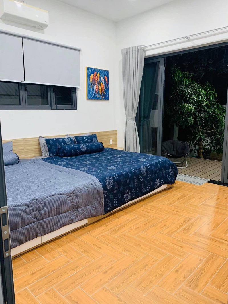 Phòng ngủ với chiếc giường lớn, hướng nhìn ra sân vườn mát mẻ.