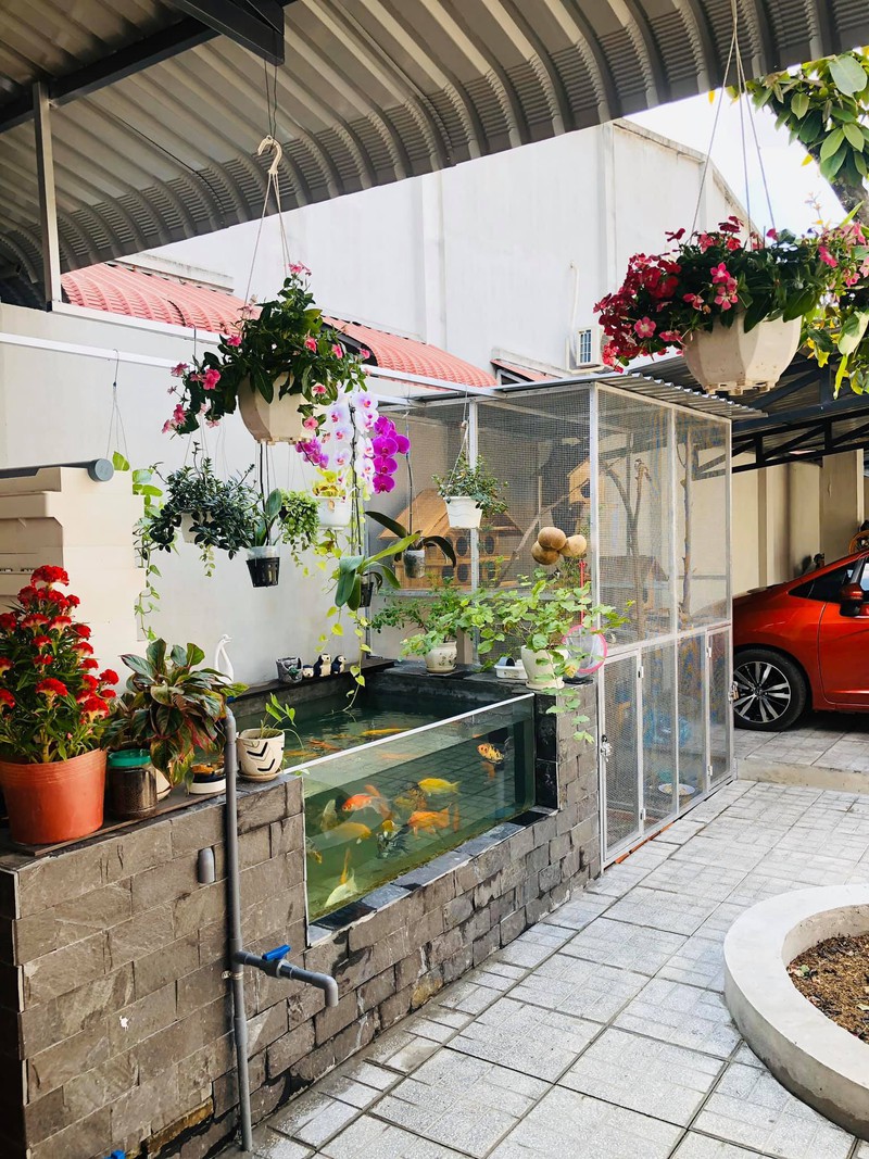 Bàn ăn lớn cho đại gia đình, gần đó là bể cá và chuồng nuôi chim cảnh, thỏa mãn đam mê của anh Thành.