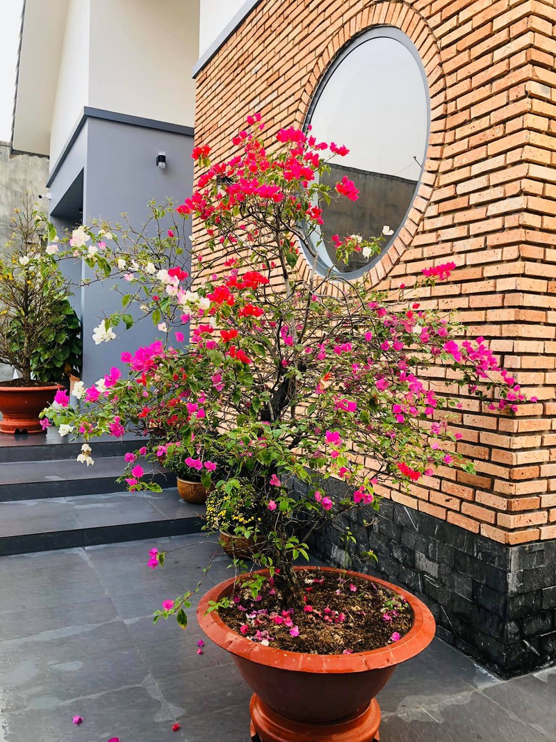 Ngôi nhà cấp 4 mái so le, một phần tường ốp gạch đỏ dân dã nhưng khá nổi bật. Gia chủ chú trọng vào cảnh quan và sân vườn với nhiều loại hoa khoe sắc.