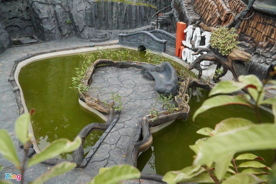 Phía trước là hồ nước, tiểu cảnh. Xung quanh là các bậc ta luy được xử lý cỏ xanh và khối đá nhân tạo.
