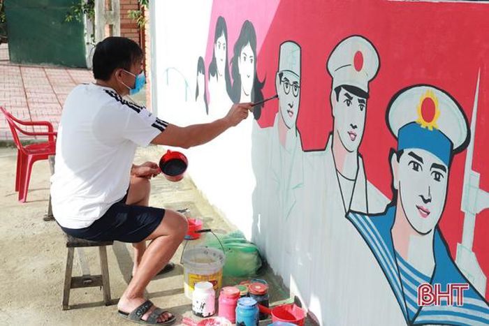 Ông Hoàng Minh Thắng thôn Hồng Thủy vẽ con đường bích họa tại thôn Hồng Thủy, xã Xuân Hải
