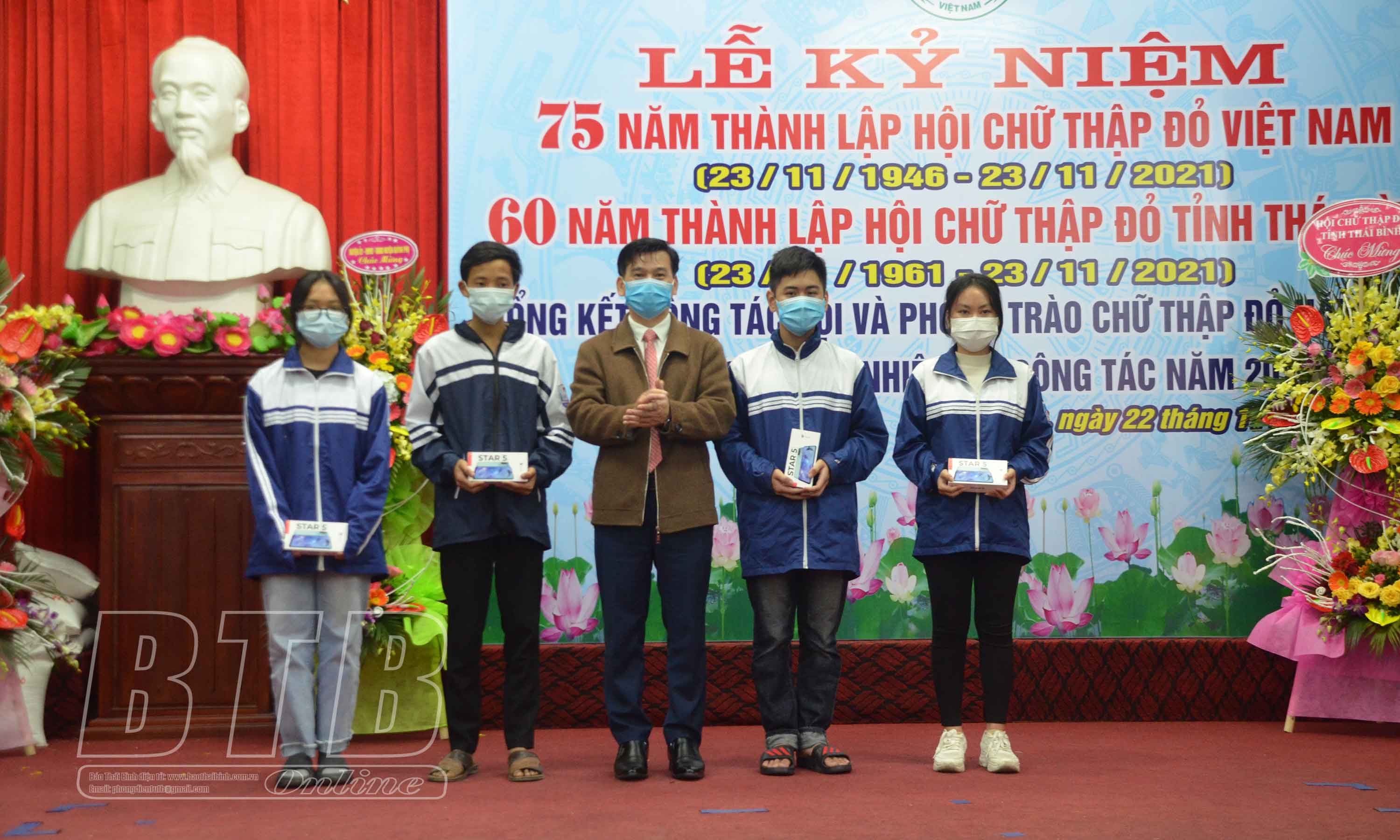 Lãnh đạo Hội CTĐ tỉnh trao điện thoại thông minh để học tập trực tuyến cho các em học sinh có hoàn cảnh khó khăn.