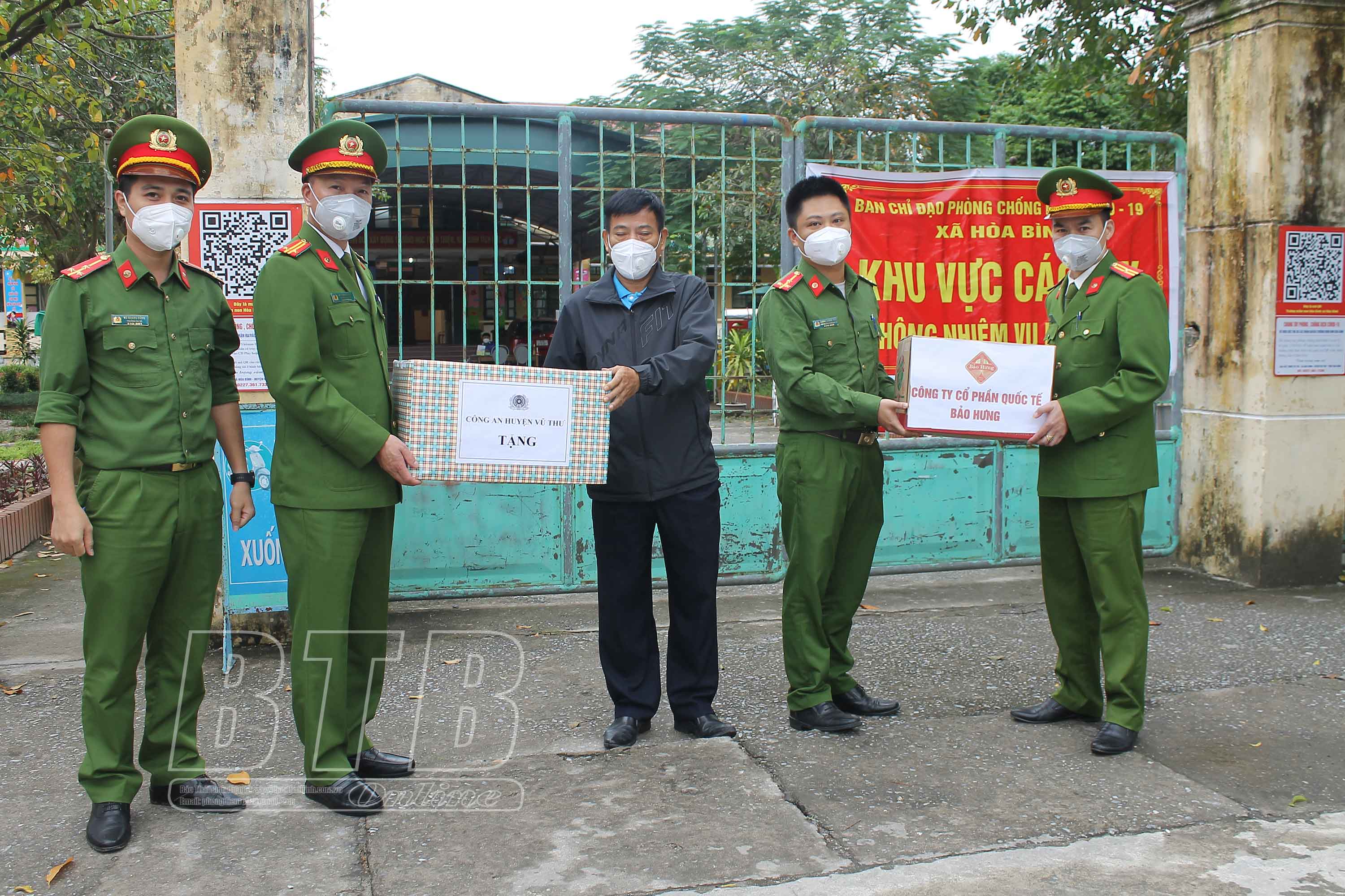 Lãnh đạo Công an huyện Vũ Thư trao quà cho lực lượng làm nhiệm vụ phòng, chống dịch tại khu cách ly y tế tập trung xã Hòa Bình.
