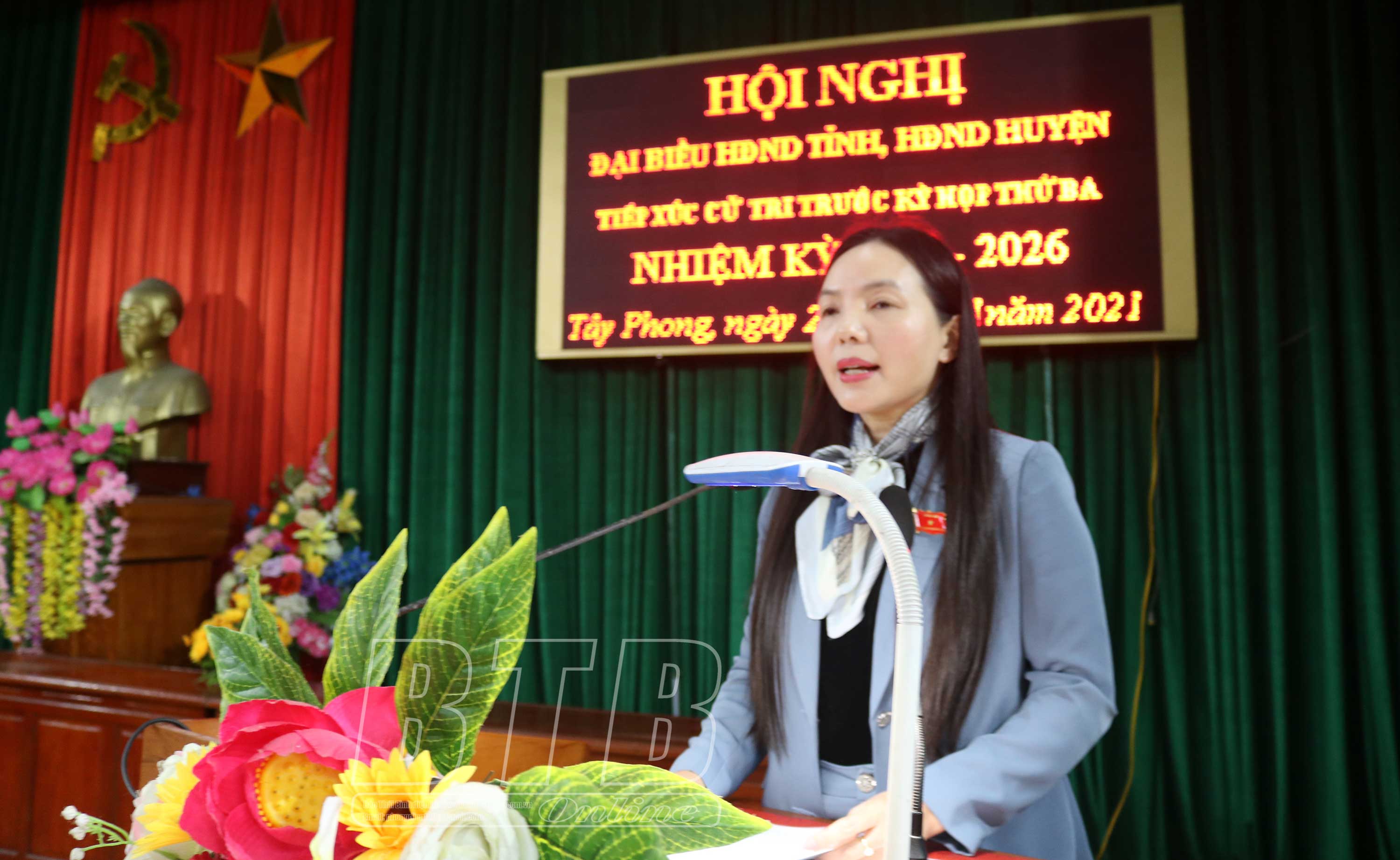 Đồng chí Ngô Thị Kim Hoàn, Ủy viên Ban Thường vụ, Chủ nhiệm Ủy ban Kiểm tra Tỉnh ủy phát biểu tại hội nghị tiếp xúc cử tri huyện Tiền Hải. Ảnh: Tiến Đạt