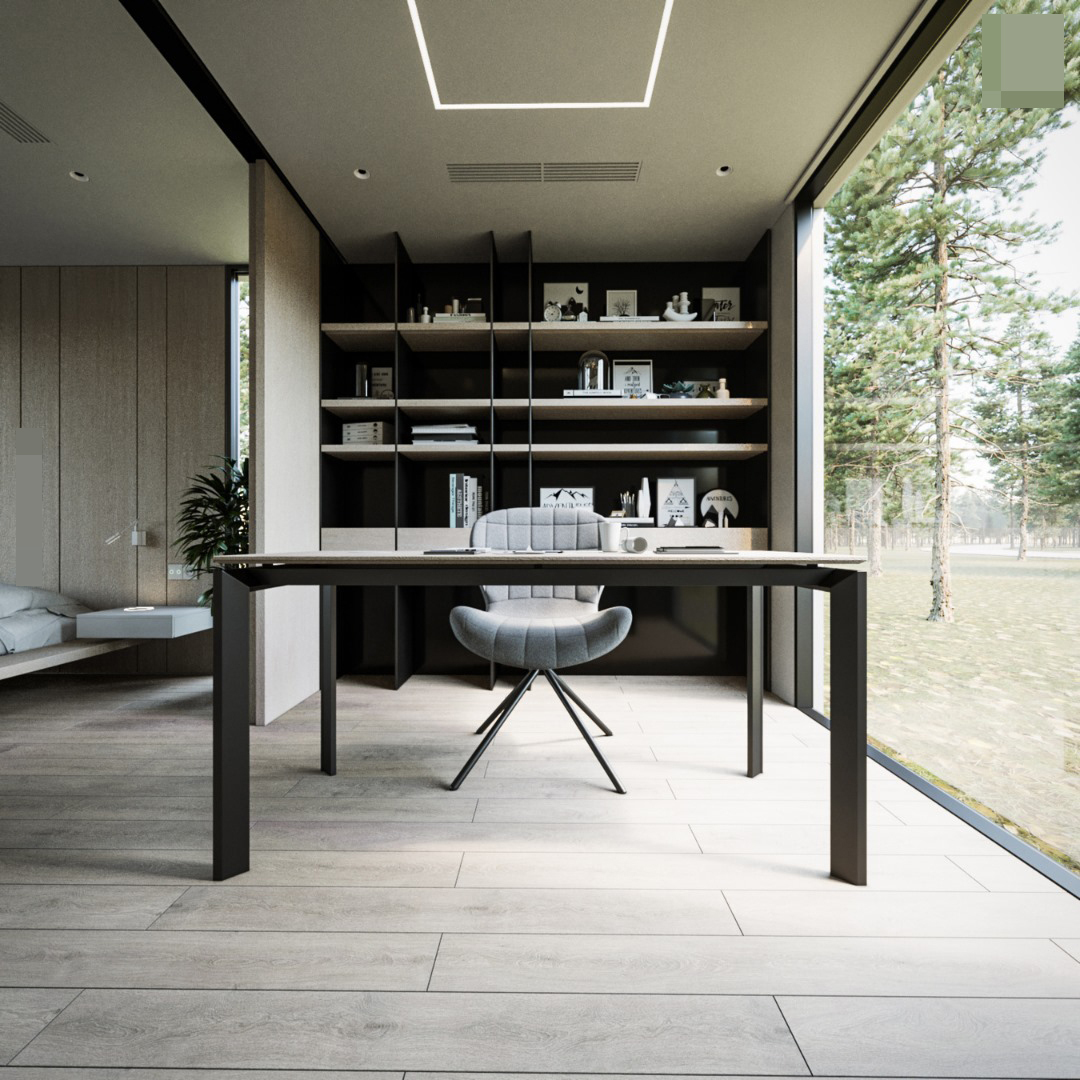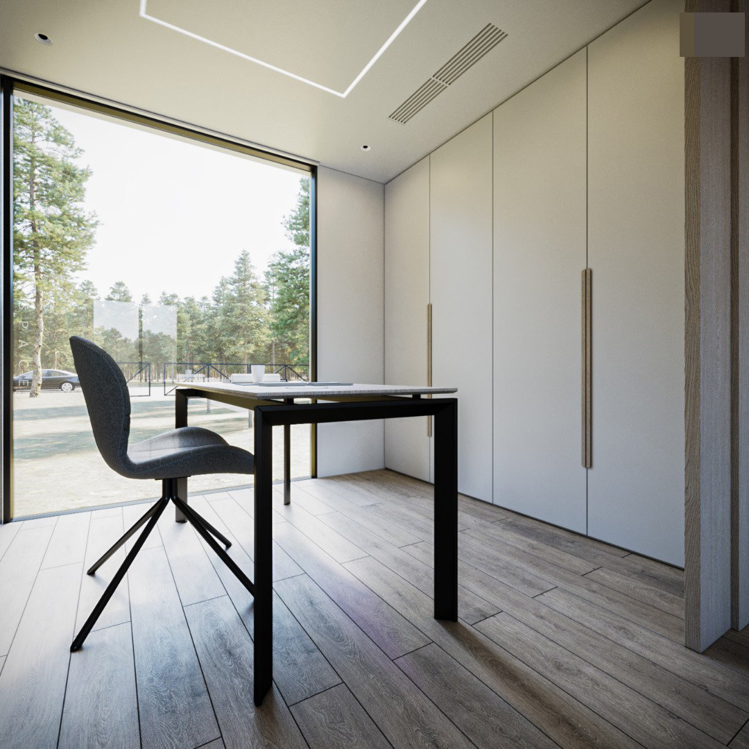Phòng làm việc tối giản, hệ tủ âm tường cất đồ ngăn nắp.