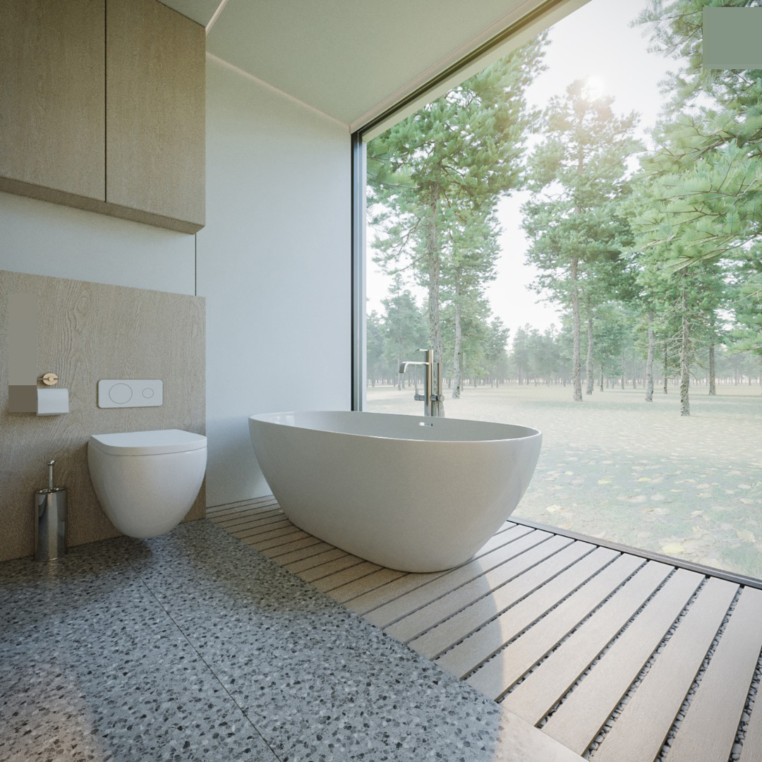 Phòng tắm sang trọng, bồn cầu âm tường cảm ứng và bồn tắm nhìn ra rừng thông bao la. Mỗi khi thư giãn, ngâm mình trong làn nước mát với hương thơm dịu nhẹ từ những cánh hoa, tận hưởng không gian thoáng đãng chắc chắn là khoảnh khắc thú vị cho gia chủ.