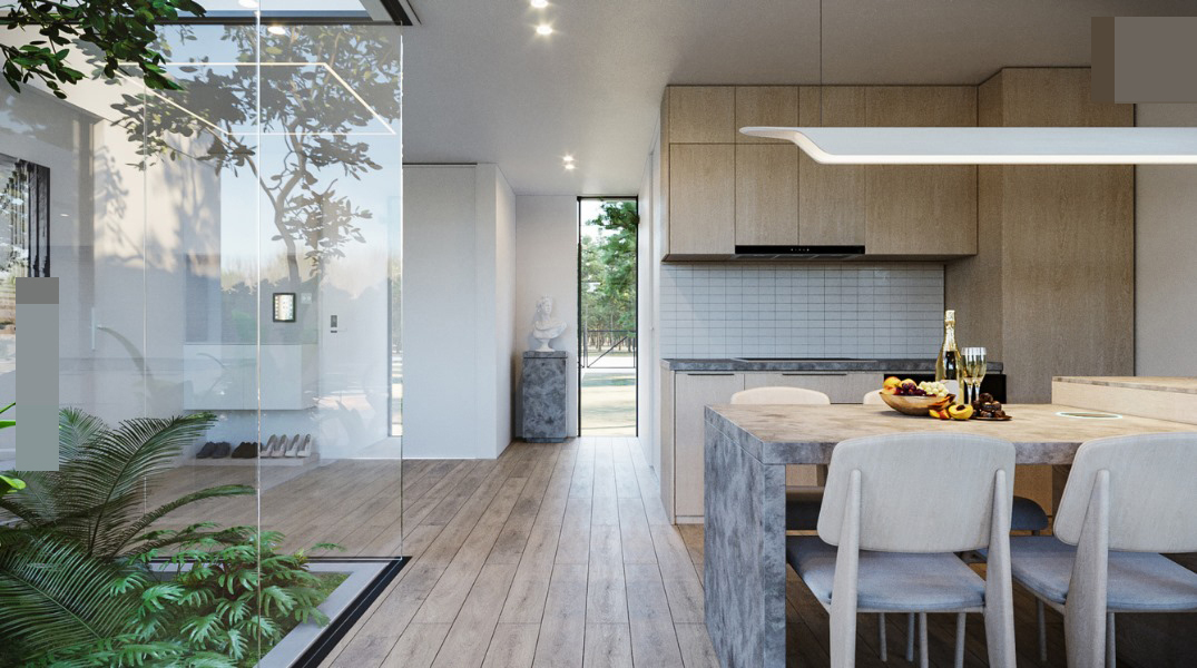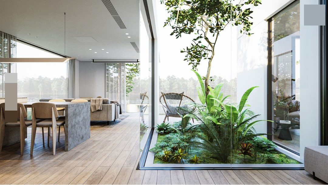 Khoảng giữa kết nối hai phần nhà là mảnh vườn mini. Nhóm kiến trúc sư sử dụng các mảng kính lớn thay tường để đón ánh sáng tự nhiên vào nhà. Đây cũng là giải pháp để mang không gian sống hòa hợp với thiên nhiên hơn.